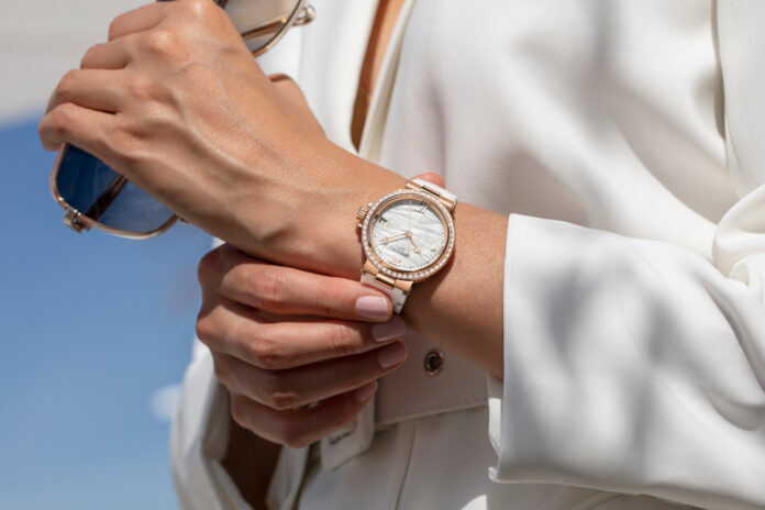 El nuevo Marine Dame de Breguet celebra el universo marino con numerosos detalles. El diseño de los números romanos evoca el de los gallardetes náuticos. Para su uso de noche, las agujas pomme están rellenas de material luminiscente, al igual que los marcadores de 5 minutos y los índices.