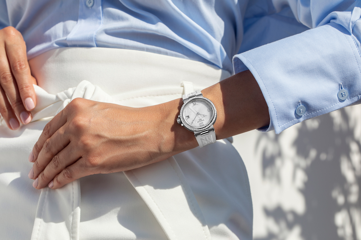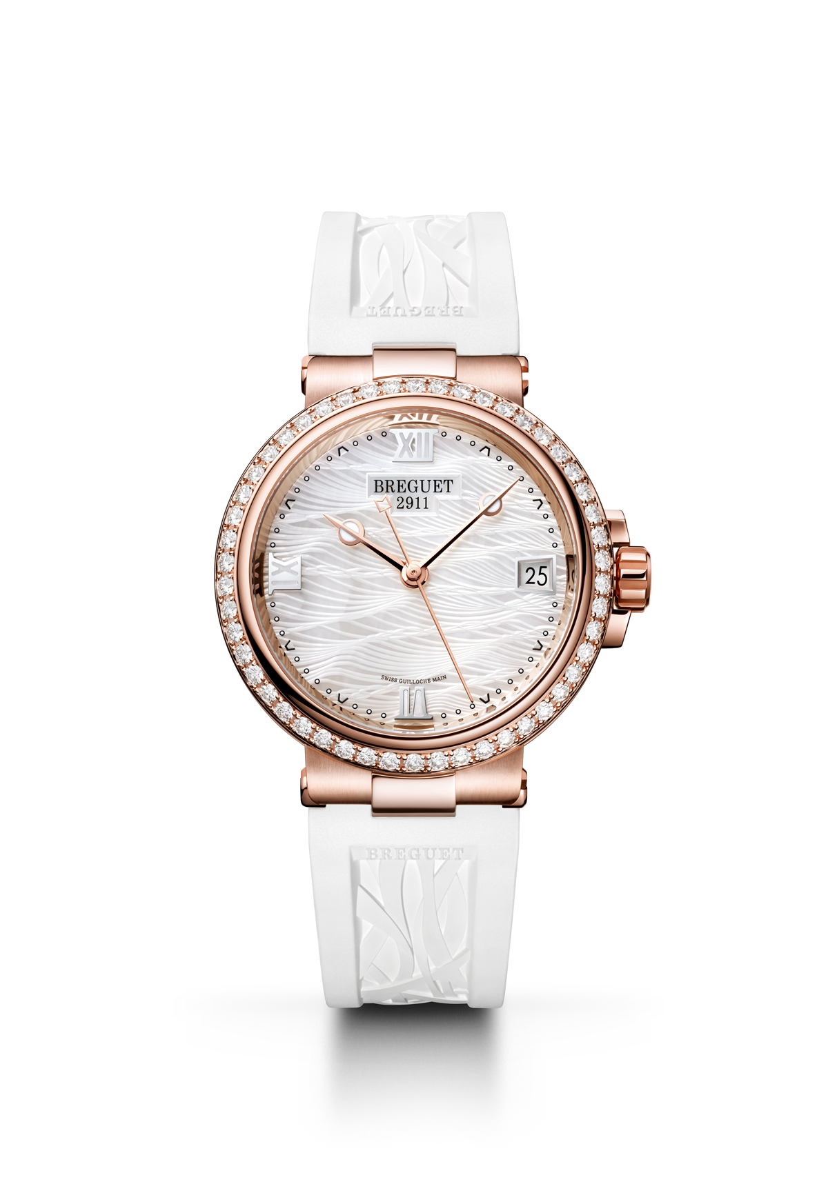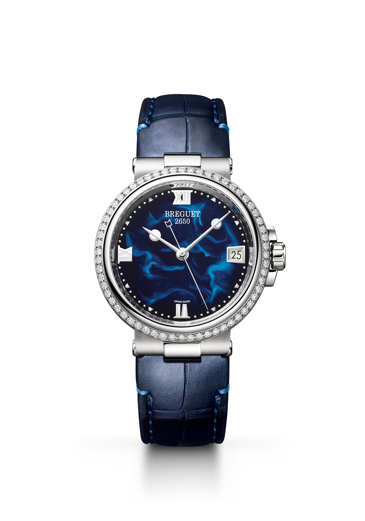 Con su saber hacer relojero especializado, Breguet da vida al Marine para mujer, una colección inspirada en el mundo de los océanos. La Maison, especialista en el arte del guilloché, ha concebido un motivo original que evoca la fluidez de las olas. Entre los numerosos detalles que remiten al universo marino también está el segundero, decorado con un pabellón marítimo que ilustra la inicial de Breguet.