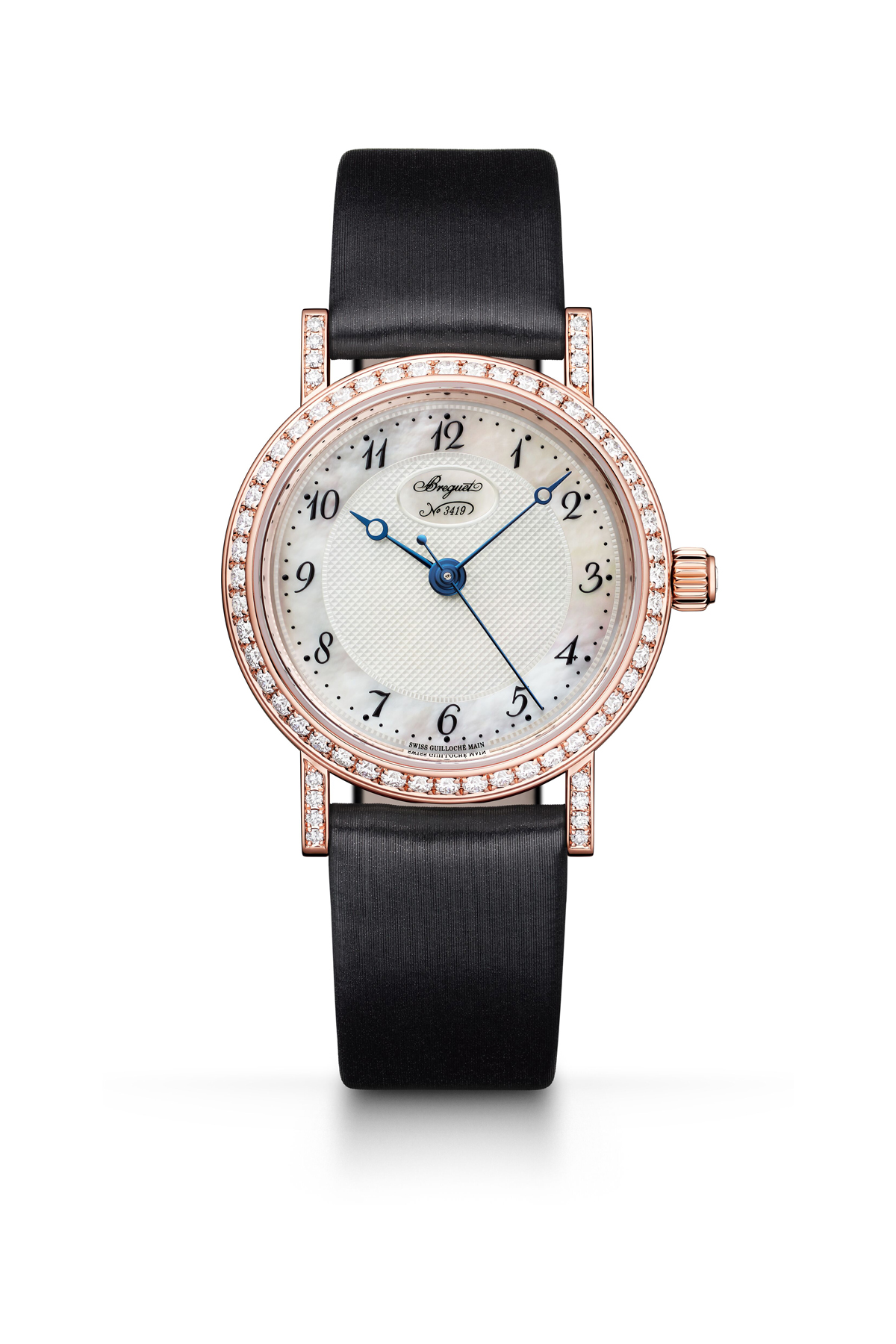 Más allá de los diferentes estilos que permiten sus correas, la esfera del nuevo Classique Dame 8068 muestra un nuevo aspecto que combina modernidad y refinamiento. La corona, inicialmente propuesta con un zafiro azul, lleva ahora un diamante cabujón. La caja de 30 mm presenta bisel y asas engastados con 64 diamantes talla brillante. La esfera de nácar está adornada con un finísimo guilloché realizado por los propios artesanos de la Manufactura. Para aportar ligereza visual, las cifras arábigas características de Breguet componen el círculo de las horas. Por último, un sutil cartucho ovalado presenta el logotipo de la marca, situado a las 12 horas.