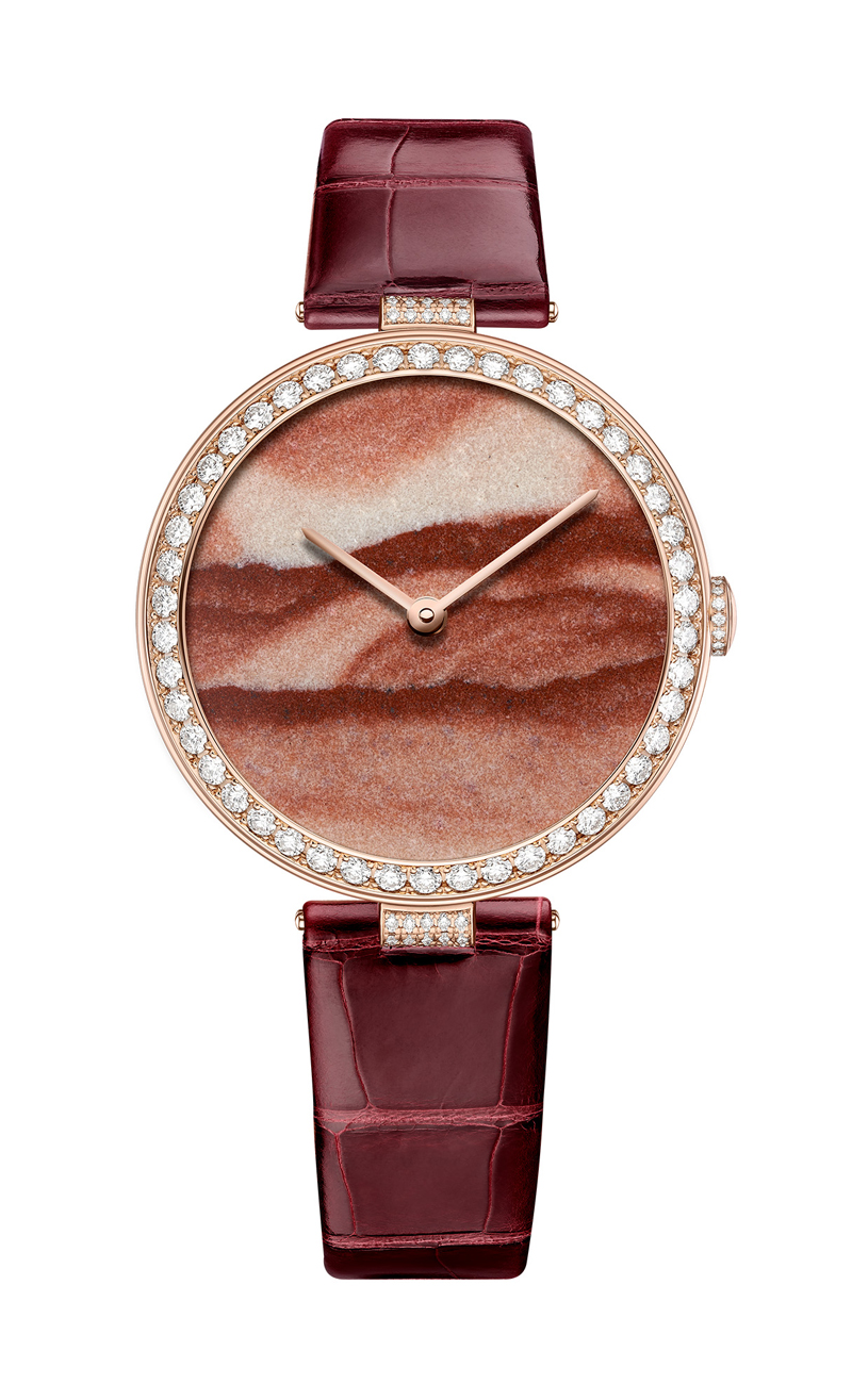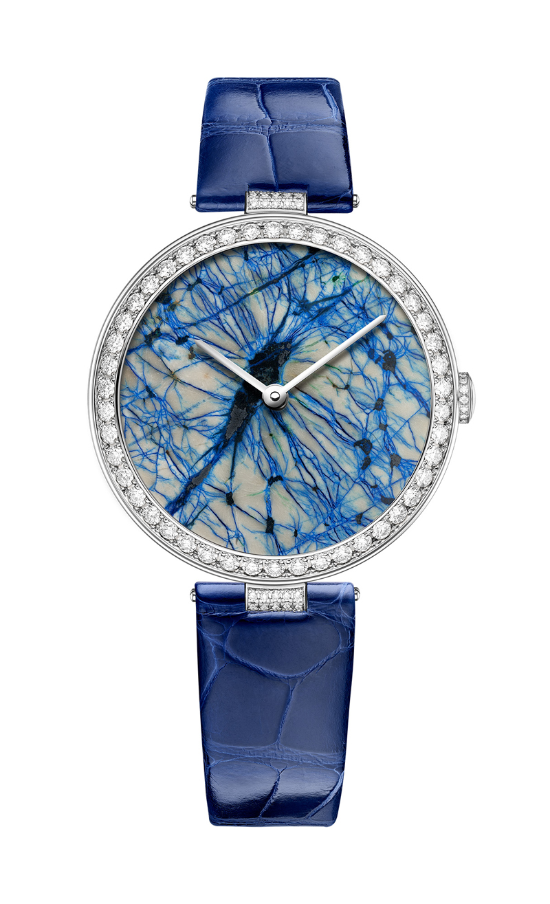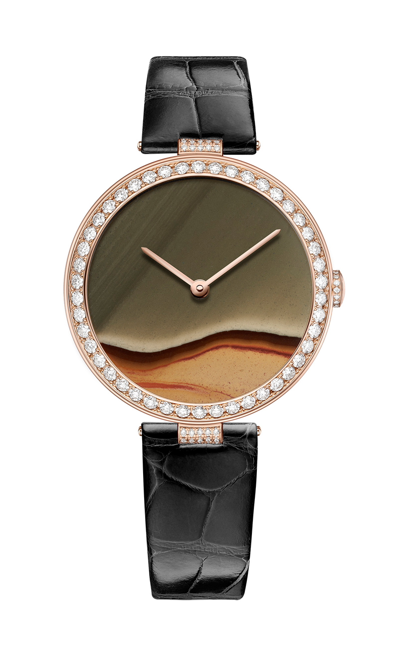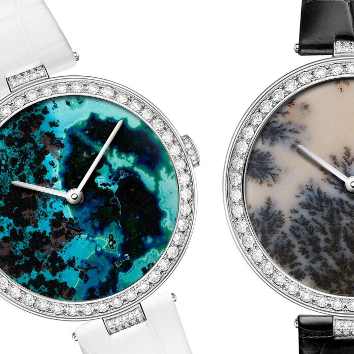 Chaumet está celebrando esta tradición con una colección de relojes excepcionales que combinan la incomparable habilidad de la casa con las ofrendas de la tierra. Jaspe mookaite, ópalo dendrítico o ágata, rodonita, pietersita, shattuckita, azurita, lapislázuli, crisocola o madera opalizada…cuidadosamente elegida por su singular belleza y su poder evocador, cada esfera de piedras ornamentales está realzada por un bisel de oro blanco o rosa con diamantes incrustados y una correa de cocodrilo que refleja sutilmente sus tonos. Cada pieza es única, una belleza maravilosa que representa la aparición de un paisaje libre de reglas y convenciones en la esfera, emotiva en su sorprendente simplicidad.