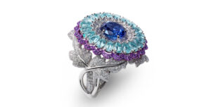 Desde su concepto hasta su realización en el seno de los talleres de Alta Joyería de Chopard, la deslumbrante Colección Red Carpet se ha vestido de luz arrastrada por el talento y la experiencia de sus « Mains d’Art ». Y para abrir este baile suntuoso Caroline Scheufele desvela algunas de estas creaciones antes del Festival de Cannes. Para empezar, un aderezo formado por un collar, una sortija y un par de pendientes: unas suntuosas tanzanitas talla corazón, turmalinas Paraíba, amatistas y diamantes se combinan dentro de unos ligeros círculos de oro blanco de 18 quilates y titanio. Solo el collar ha requerido nada menos que 14 semanas de trabajo, el testimonio de la quintaesencia de la excelencia joyera que representa Chopard. Ofrece un sublime anticipo de uno de los símbolos fundamentales de esta Colección Red Carpet: la talla corazón, junto al fulgor de las piedras de color que serán otros de los símbolos de esta colección que explora el AMOR a través de todas sus expresiones.