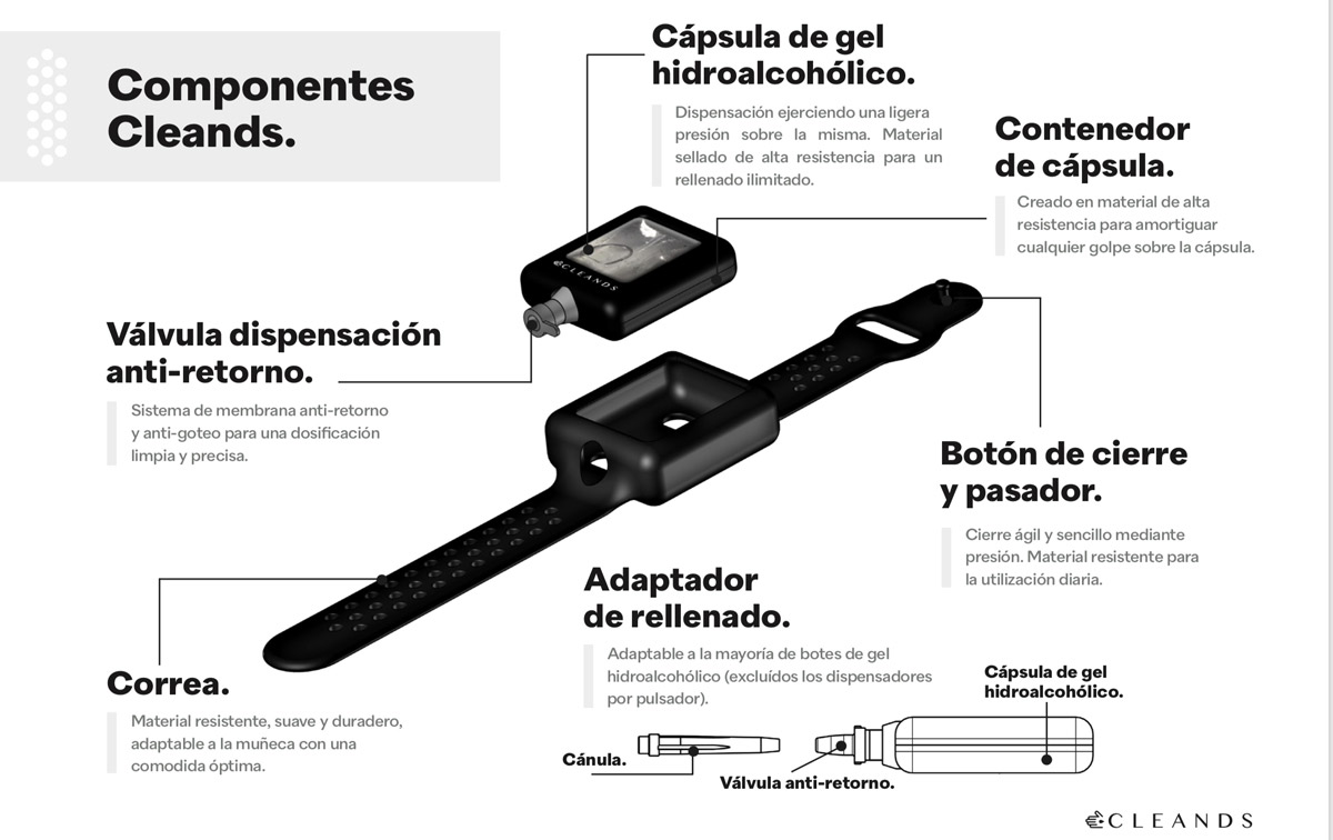 Cleands surge como un “Wearable” para llevar en el día a día en una situación donde necesitemos ese extra de protección constante. En forma de pulsera, se compone de una cápsula para contener el gel hidroalcohólico y una boquilla dispensadora. Cuenta con una cápsula de gel hidroalcohólico y la dispensación se produce ejerciendo una ligera presión sobre la misma.