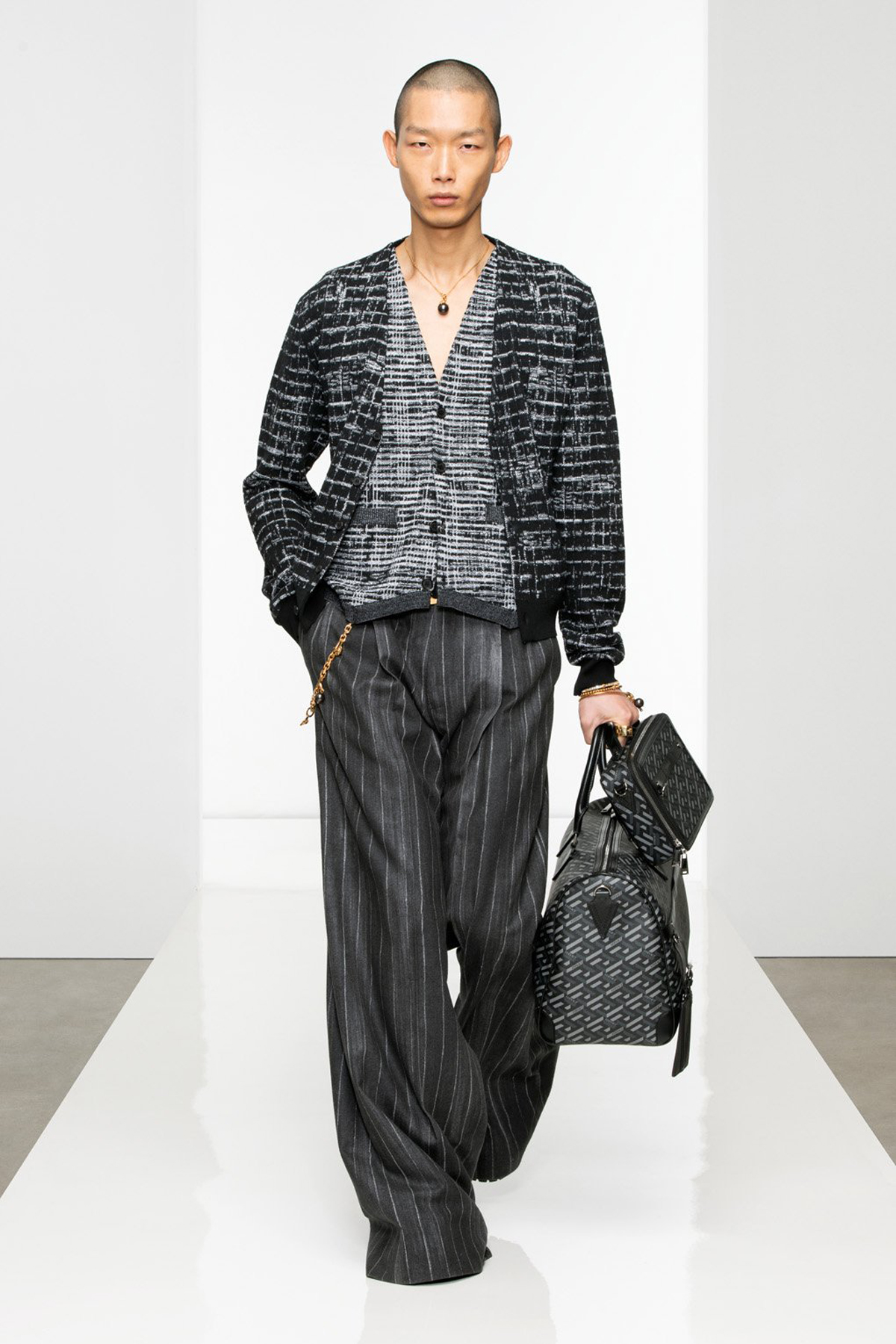 Joyas colocadas con total naturalidad, transmitiendo que forman parte del estilismo y que son un must. Así lo transmite Versace en su desfile FW22 con colgantes, pulseras y anillos. Las perlas, formas geométricas, logos o anillos sello toman el protagonismo.
