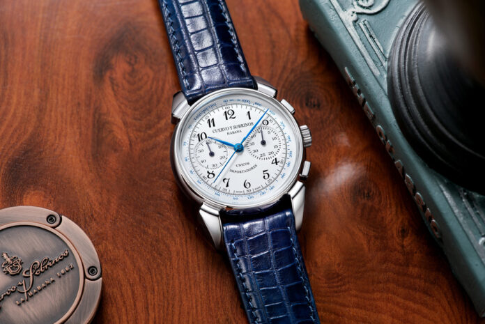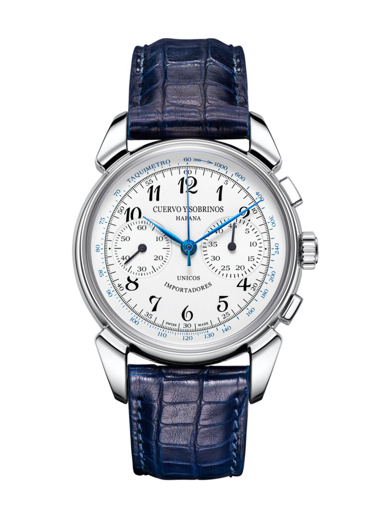 En 1946, Cuervo y Sobrinos fabricaba sus propias joyas y relojes, pero también era un destacado minorista en el continente americano. La compañía vendía algunas de las marcas de relojes más importantes de la época, y varias firmas grababan las esferas de sus relojes con el nombre Cuervo y Sobrinos. Estos relojes de marca compartida fueron producidos por Longines, Patek Philippe y Rolex, por nombrar solo algunos. Además, las esferas a menudo se marcaban con el texto “únicos importadores”, una referencia a la exclusividad del prestigioso minorista. Cuervo y Sobrinos replica este texto histórico en su última propuesta.