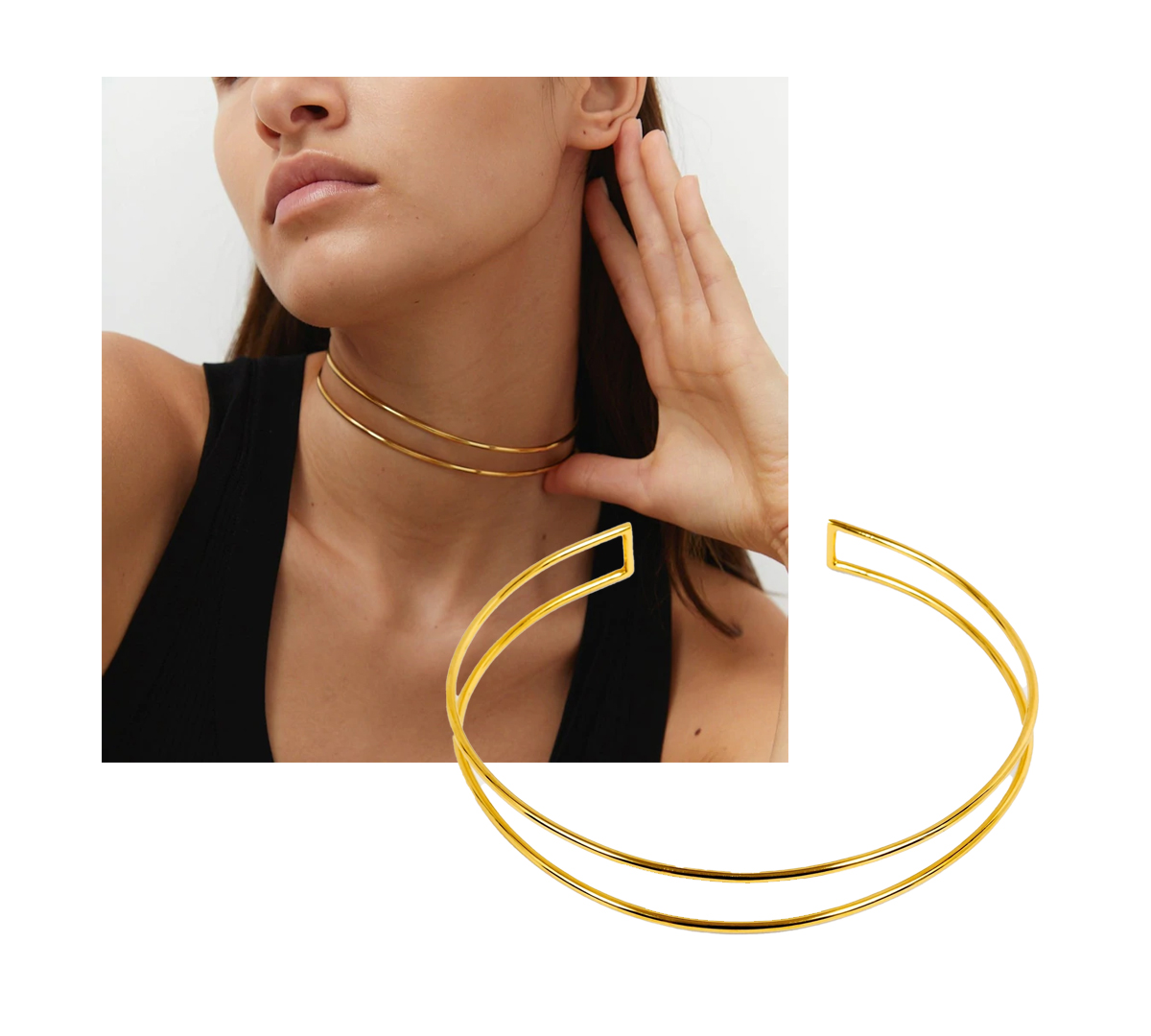 Más allá de las cadenas, los pendientes XL o los anillos en su versión «más es más«, los chokers vuelven a emprender su regreso al podio en cuestión tendencias y, además, lo hacen aliándose con otras tendencias del momento. Las formas geométricas y esos códigos propios de los años 80 se han convertido en una obsesión, al mismo tiempo que las joyas en dorado ofrecen una estética que también es deseo. Y, bajo estas premisas, llega el choker que ya es viral y que no dejamos de ver tanto en Instagram como en TikTok: rígido, dorado, geométrico y de doble aro.