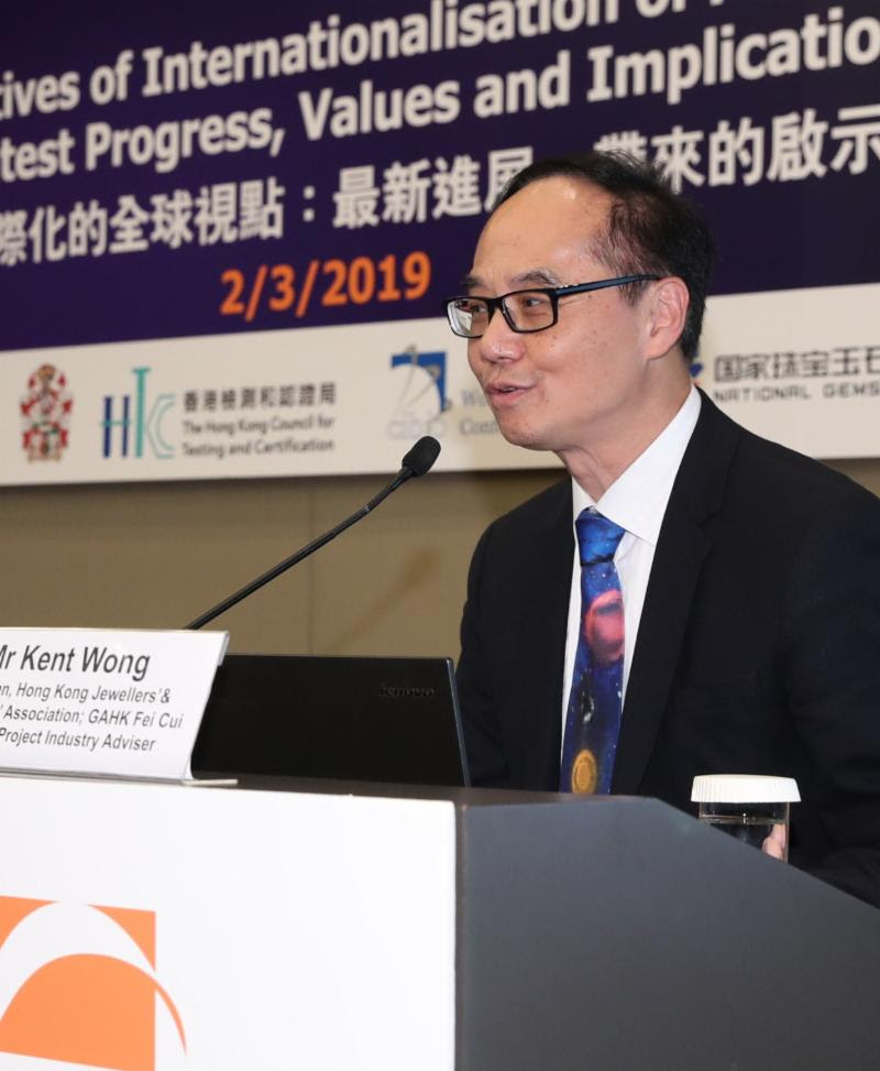 Kent Wong, Director Ejecutivo del grupo de joyería Chow Tai Fook y Presidente del Comité Asesor de Joyería del Consejo de Desarrollo Comercial de Hong Kong, abordó el seminario sobre la internacionalización del Estándar Fei Cui el 2 de marzo.