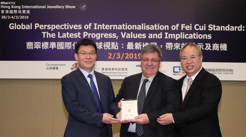 El presidente del CIBJO Gaetano Cavalieri (en el centro) recibe un premio de apreciación por parte de Liang Zhenjie, Director de NGTC, y Eddie Fan, Presidente de GAHK, durante los semanarios celebrados en el Internationalisation of the Fei Cui Standard el pasado 2 de marzo.