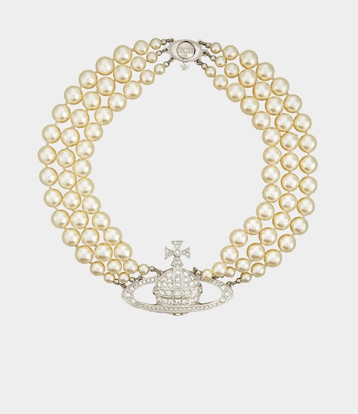 Hablamos del collar de perlas más reconocido de Vivienne Westwood: el choker que más han lucido las celebrities a lo largo del tiempo, de tres vueltas, diseñado con 92 perlas veganas de Swarovski y el broche creado por la diseñadora que es, concretamente, lo que marca la diferencia en este collar. El broche en cuestión tiene un gran significado y es que se trata del símbolo L’Orb, que mezcla el globo terráqueo creado para Carlos II que representaba la soberanía de la corona británica, haciendo alusión a lo histórico, con la imagen del planeta Saturno, como idea de futuro. Así mismo es un símbolo e la época de Westwood entre finales de los 80 y principios de los 90, cuando sus colecciones cambiaron de la estética punk con un toque romántico, al mundo Royal. Fue en 1990 cuando la diseñadora introdujo un collar de perlas de tres vueltas por primera vez y, en 1992 cuando ya se empezó a ver este choker tan deseado que hoy se revaloriza.