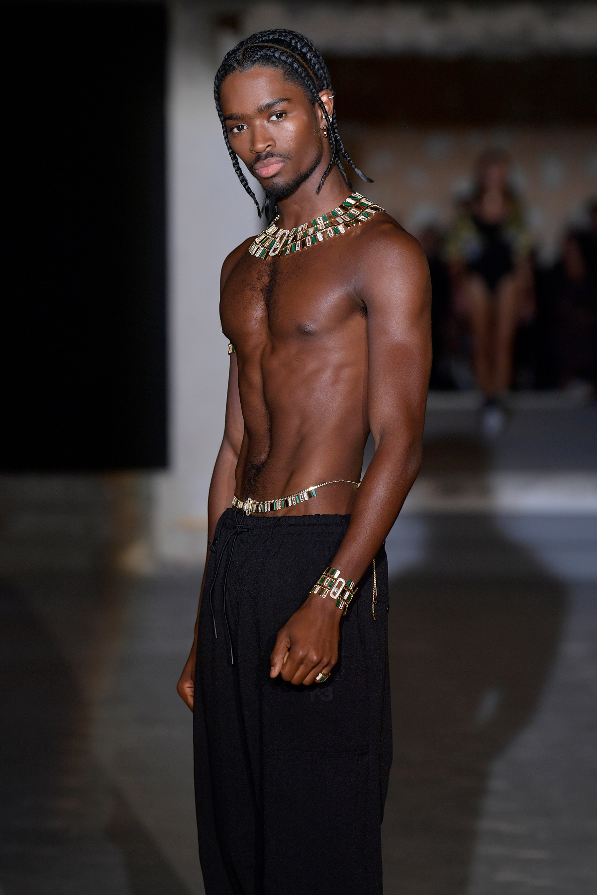 Una colección inspirada en una visión futurista del antiguo Egipto a través de piezas audaces encarnan los códigos emblemáticos de la Maison: atreverse, sorprender y superarse. Pecheras de gran tamaño, joyas para la boca, piezas etéreas que acompañan el movimiento, multicolores cautivadores, piezas transformables… Un espectáculo bajo el signo de una supuesta Casa de ultralujo, mezclado inesperadamente con looks de calle de Adidas.