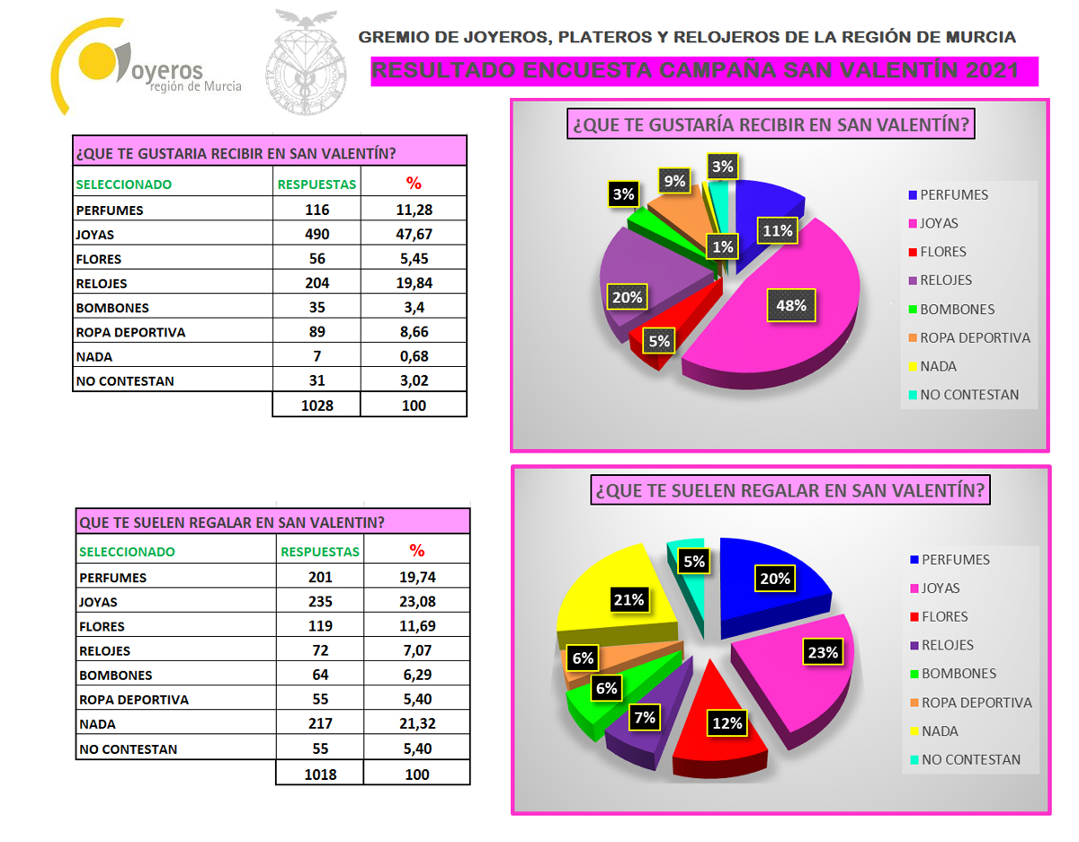 En esta encuesta, casi la mitad de los participantes (47%) expresaron que el regalo que más les gustaría recibir en San Valentín es una joya, seguido de relojes (19%) y perfumes (11%). Dato que contraste claramente con el resultado al preguntarles el regalo que solían recibir el citado día ya que tan sólo el 23% recibían joyas, el 21% nada y el 19% perfumes.