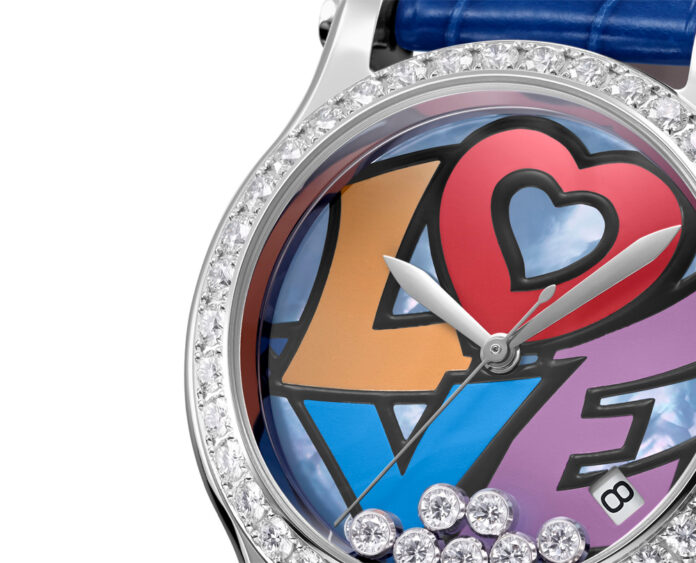 Con Happy Love los siete diamantes móviles están invitados a continuar con su alegre baile en una esfera de nácar azul que difunde un mensaje de universalidad, unas vibraciones eminentemente positivas: LOVE. Las cuatro letras están alegremente coloreadas y estilizadas al estilo de una pintada de street art, añadiendo un toque de color a este reloj decididamente contemporáneo que no ha cesado de reinventarse en más de un cuarto de siglo de existencia. Un detalle suplementario es la letra O, que se ha trabajado cuidadosamente en forma de corazón: una referencia directa al símbolo fetiche de Chopard, la Casa del Gran Corazón.