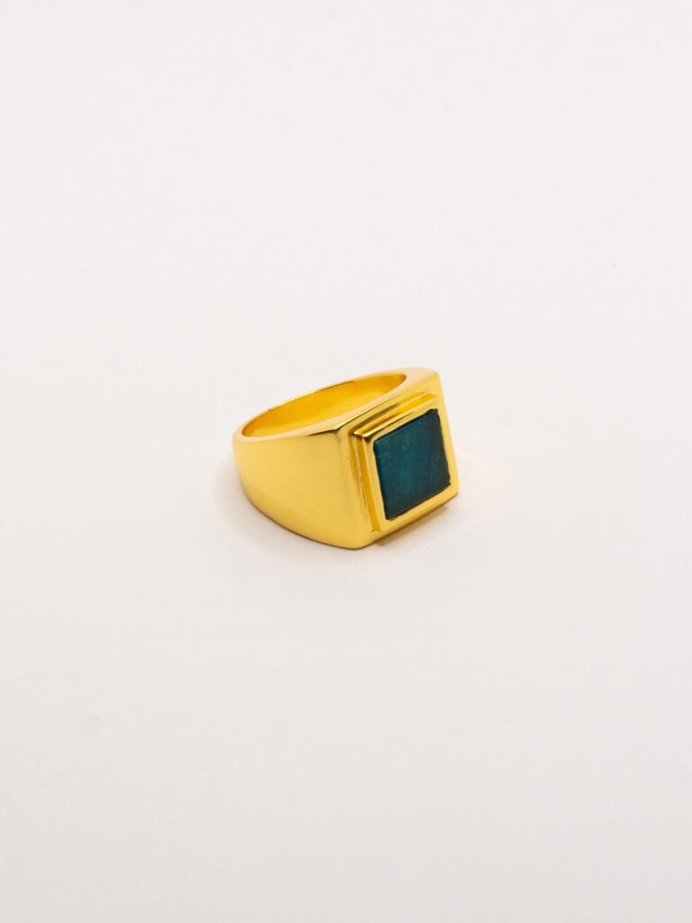 De estética vintage y en forma de sello cuadrado, con piedra azul petróleo, este anillo es ideal para el día a día y cuenta con ese diseño único que lo hace más especial.
