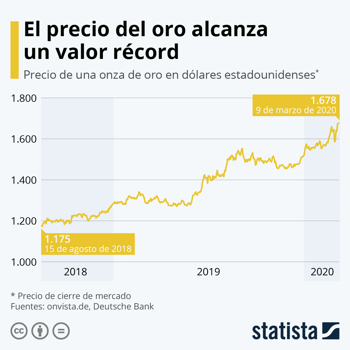 Este lunes 9 de marzo el precio del oro alcanzó un valor de 1.678 dólares estadounidenses la onza, precio récord desde finales de 2012, es decir, más de ocho años atrás. Además, desde septiembre de 2018, esta tendencia alcista ha estado especialmente marcada y solo ha sido interrumpida en contadas ocasiones.