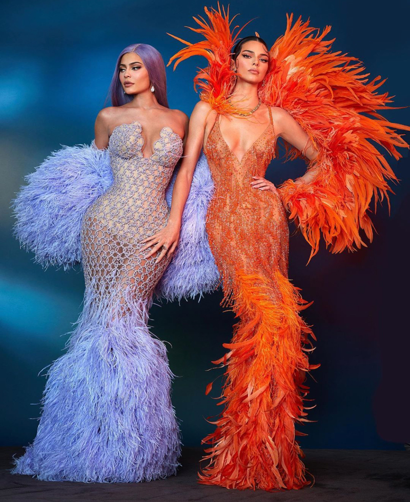 Kendall y Kylie Jenner se alejaron de las típicos códigos de vestir del clan Kardashian para, por fin, cumplir con el dress code de la gala MET. Dos vestidos a juego pero en diferentes colores, en morado y en naranja, inspirados en el mítico naked dress de Cher y firmados por Versace. Kendall, además, acompañaba su gran vestido naranja de plumas con joyas de Tiffany & Co, de la colección Tiffany Blue Book, en concreto, un collar y unos pendientes de oro de 18 quilates con topacio y diamantes.