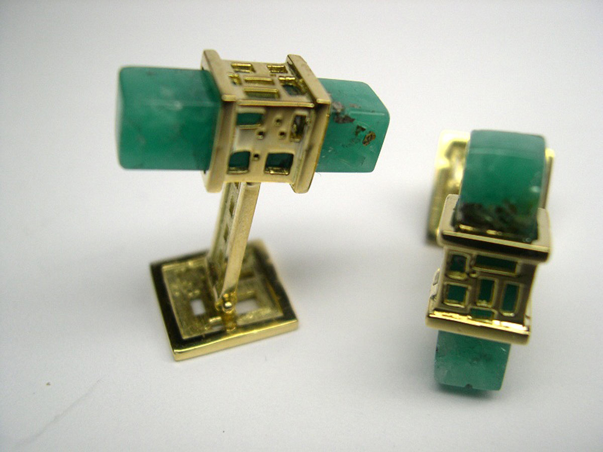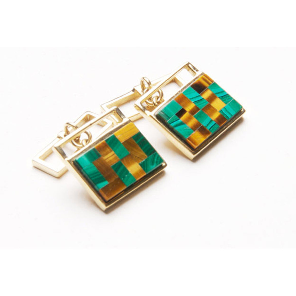 Sonia Zea nos presenta con su particular estilo, nos presenta unos originales gemelos, montados en oro amarillo con un damero realizado con malaquita y ojo de tigre, entre otras piezas.