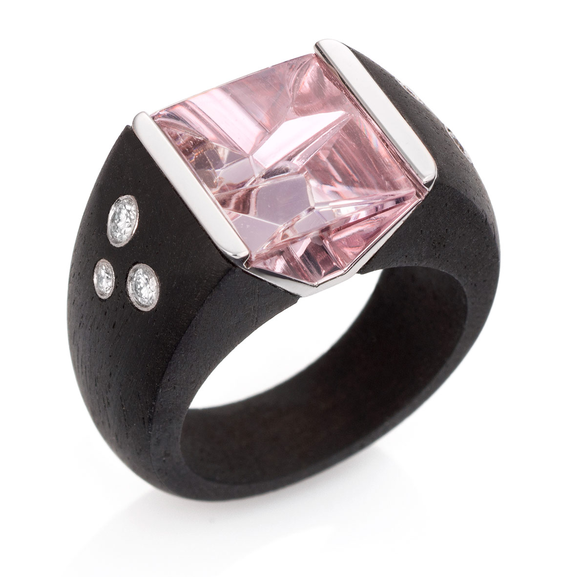 Jaime Moreno, nos sorprende de nuevo con una pieza muy exclusiva, una sortija en madera de ébano, montado con una turmalina rosa central con una talla espectacular y 5 diamantes talla brillante.