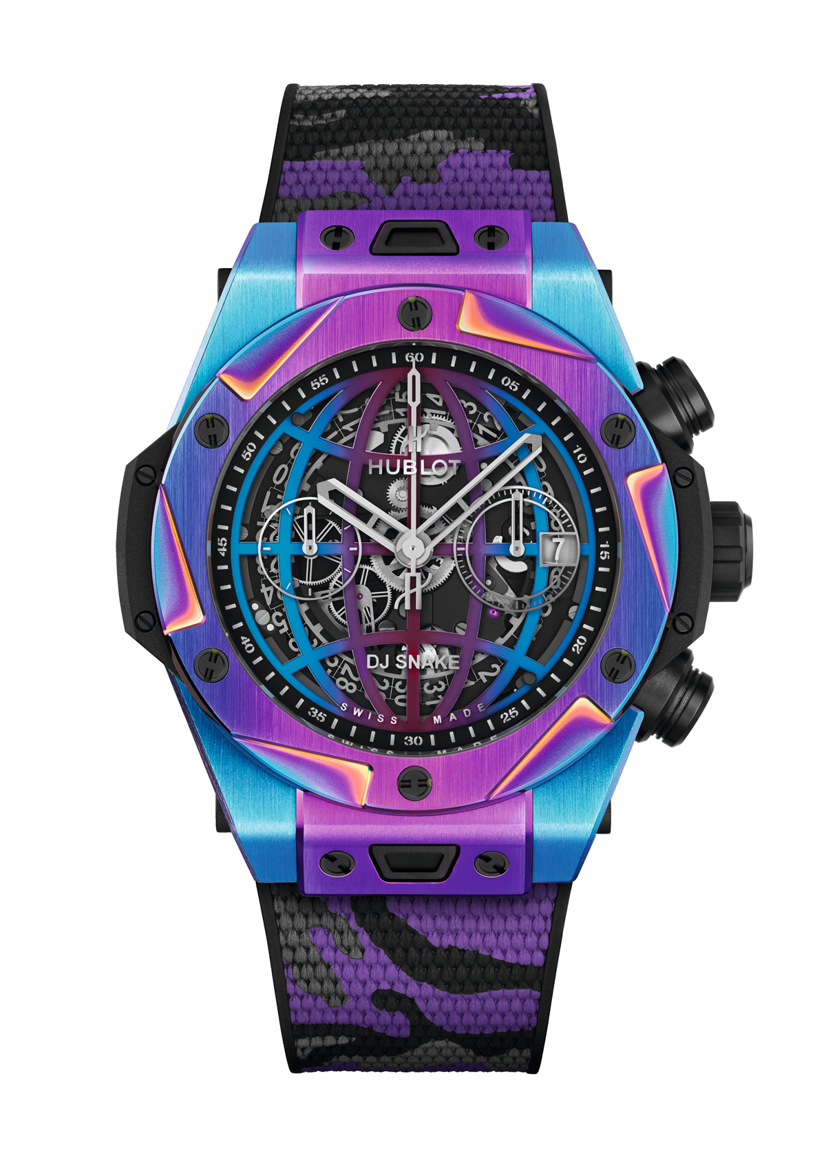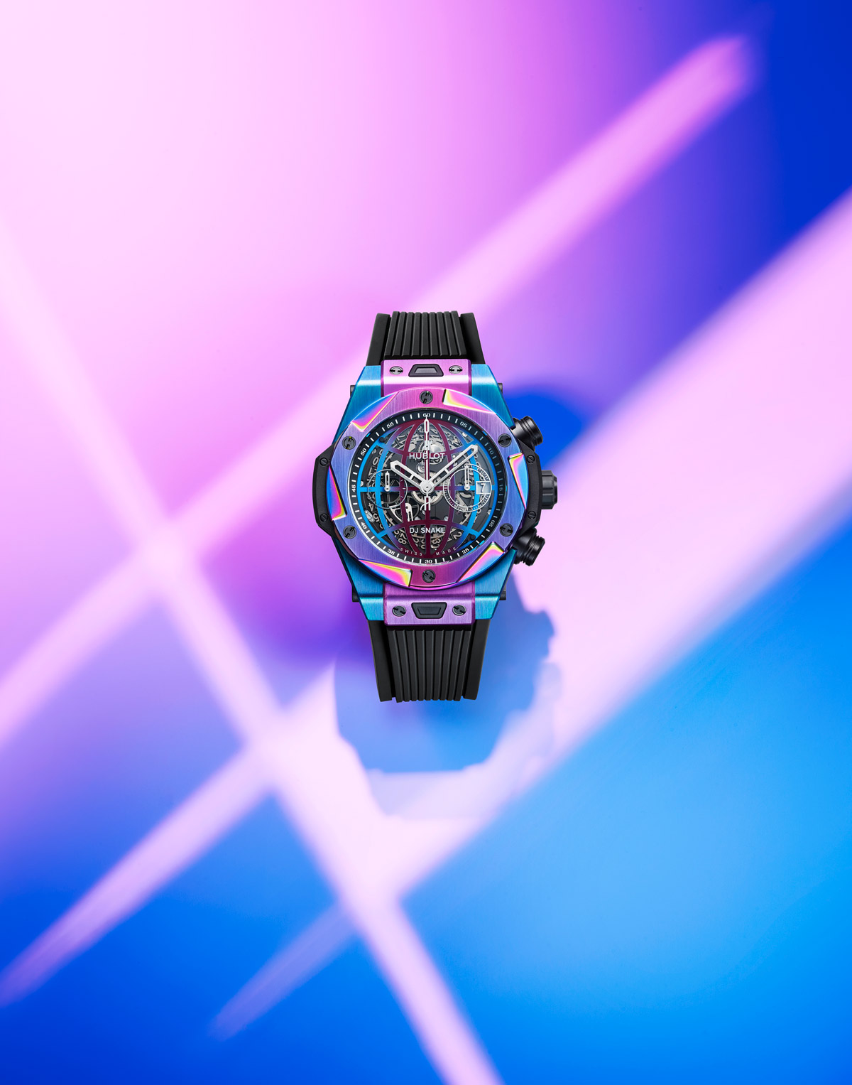 Hublot y DJ Snake son socios desde el 1 de enero de 2018. De hecho, actuó como DJ en la fiesta de clausura de Hublot de la Copa Mundial de la FIFA celebrada en Rusia. Tres años más tarde se presenta el primer reloj fruto de esta asociación: el Big Bang DJ Snake. Reconocible a primera vista, el diseño icónico del Big Bang se viste en este caso con mil reflejos de colores. El bisel, así como los seis componentes de titanio de la caja de 45 mm de diámetro, se han sometido al «efecto Newton». Este proceso, que es técnicamente similar a un tratamiento de PVD negro, se consigue utilizando cargas de color y orientando con precisión los componentes en una posición determinada para obtener el color deseado. Como resultado, brinda al reloj un espectacular aspecto iridiscente, con colores que cambian según el ángulo de visión y la iluminación. Además, la superficie de las piezas se endurece con anterioridad al tratamiento iridiscente para mejorar así su durabilidad. Una operación compleja de realizar, ya que es difícil obtener la misma gradación de color en cada uno de los 100 relojes previstos. Los cortes exteriores practicados en el bisel han sido diseñados por el propio DJ Snake. Estas muescas hacen que el Big Bang DJ Snake resulte reconocible de inmediato y distinguen a esta colección de las demás. Una ilustración del lema Hublot «El Arte de la Fusión».