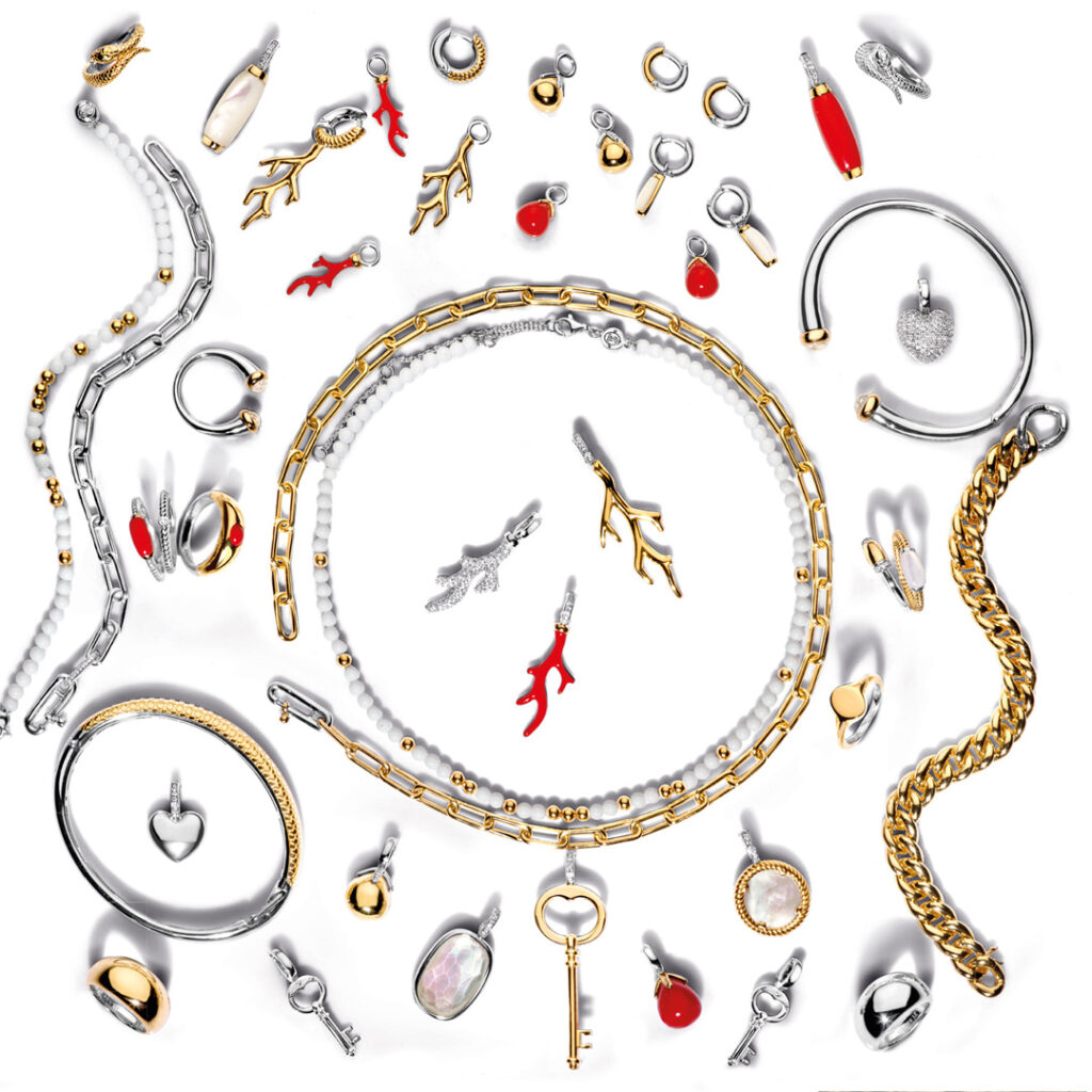 Ti Sento se caracteriza también por un Mix & Match muy personal, que nace bajo tres conceptos: charms que adornan la oreja, anillos apilables y colgantes independientes.