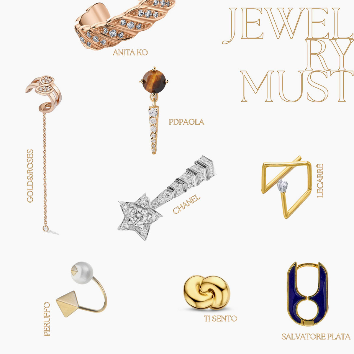 Jewelry Must: el earcuff de Anita Ko Jewelry, los piercings de Gold&Roses para crear ear looks sin necesidad de tener tantos agujeros, las piedras en los piercings de PDPAOLA que ofrecen un toque más sofisticado, las formas atrevidas de LECARRÉ y las clásicas de Ti Sento Milano, las perlas en un estilo Punk con Peruffo, los diamantes y símbolos de Chanel y la tendencia más atrevida con Salvatore Plata.