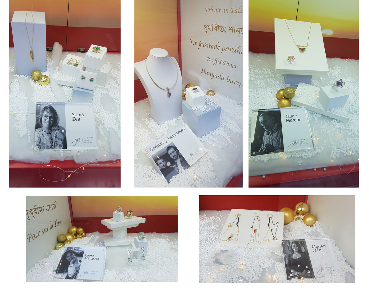 Marián Jaén, como vicepresidenta de la AJA y comisaria de la exposición, ha reunido a cinco artistas joyeros de la Asociación para esta primera colaboración; gracias a ella, el escaparate de Germán Joyero brilla de forma especial y supone, al mismo tiempo, una nueva idea que da la oportunidad a los clientes de escoger una joya diferente, con Alma.