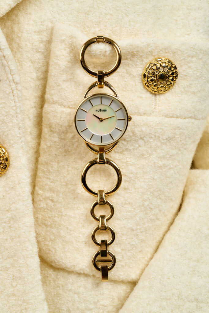 La tendencia de los eslabones, que ya triunfó en épocas pasadas y que ahora vive su mejor momento, se traslada también al sector de la relojería. Con un guiño al pasado y las técnicas del presente, este reloj joya de Potens es un must en el joyero ya sea para el día a día o para un momento especial.