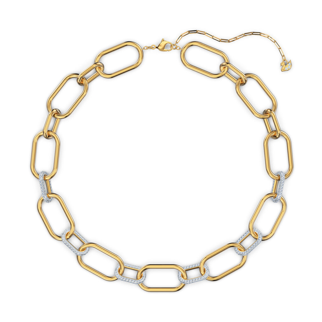 Swarovski desafía la tendencia del momento combinando los acabados metálicos con pavé de cristales transparentes que brillan intensamente creando una distribución asimétrica. Joyas compuestas por eslabones de cadena alargados y algunas de ellas incluso desmontables, ofreciendo diferentes looks.