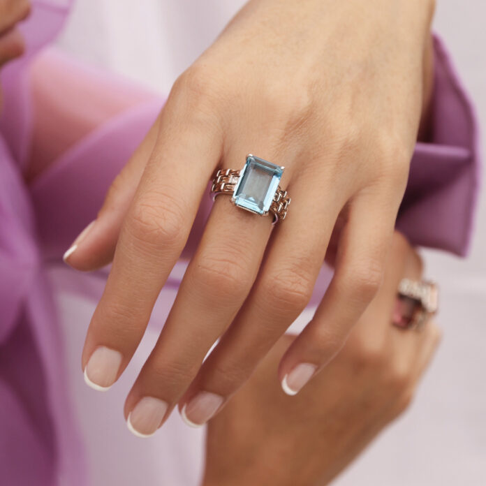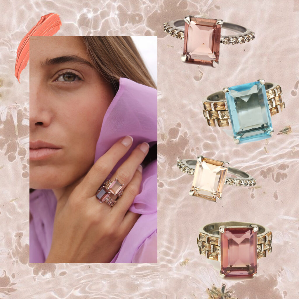 Xavier del Cerro propone, con su colección Coriolis, una fusión entre delicados colores y diseños únicos. Fabricados a mano y por encargo en el taller de la firma, ubicado en Barcelona, en plata de ley proveniente de excedentes de producción, la piedra central de cada anillo que puede ser cuarzo hidrotermal topacio azul, rodolita o morganita, añade un extra de brillo a cualquier estilismo.