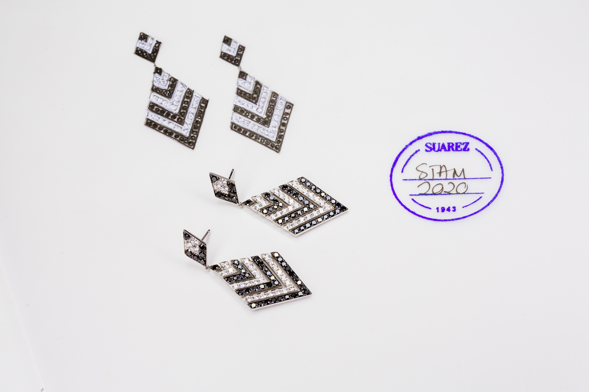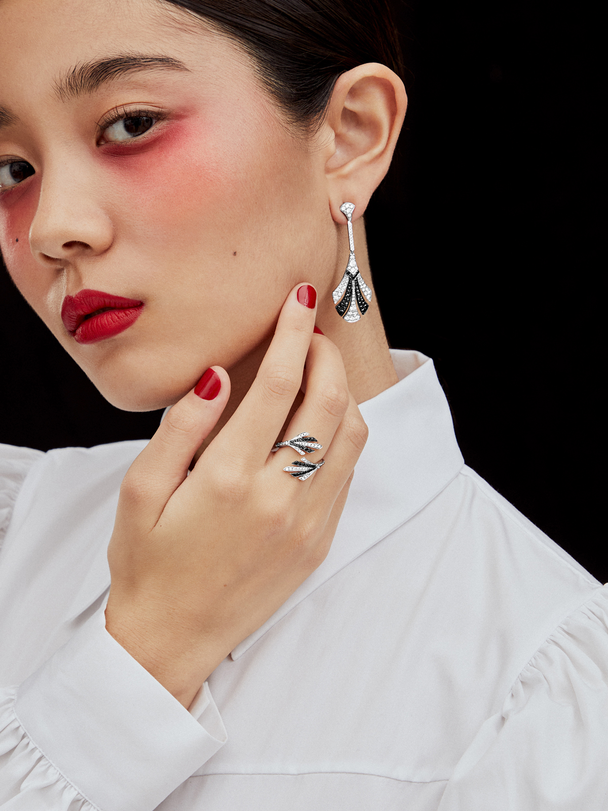 Para la creación de esta serie de joyas el equipo creativo de Suarez se ha inspirado en la arquitectura de The Siam Hotel: realizada en oro blanco con diamantes blancos y negros, refleja a la perfección su equilibrio arquitectónico.