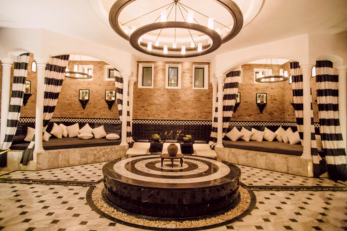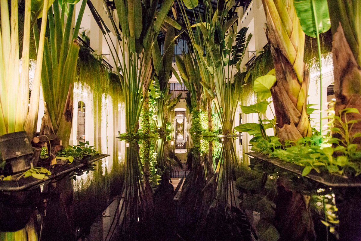 Una vez dentro, su arquitectura años 20 lo convierte en un oasis; un art Déco influenciado por motivos estéticos orientales, con el blanco y negro como protagonista. Pero con gran influencia colonial gracias a su exuberante vegetación en la que las palmeras y grandes hojas invaden los espacios comunes del edificio. Esta mezcla entre la geometría del art Déco y las formas botánicas coloniales dan como resultado una colección de joyas muy especial.