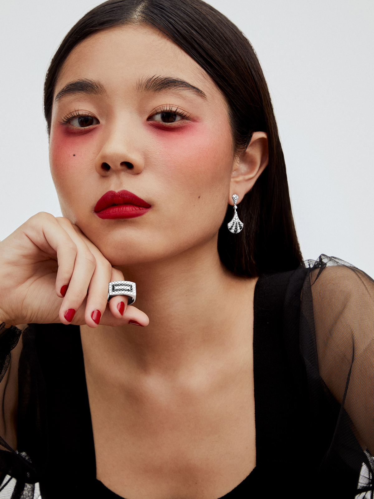Los pendientes, en cuatro diseños diferentes, han supuesto algunas complicaciones técnicas. Nuestros diseñadores han trabajado para dotarlos de gran movimiento, articulando cada una de las partes del pendiente. Los tres modelos de anillo que complementan la colección encuentran su inspiración en los motivos del mármol del hotel: un blanco y negro que dibuja formas geométricas perfectas.