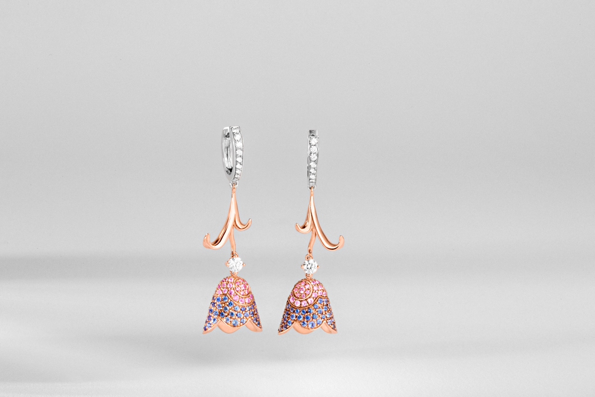 Todas las piezas de la colección se han realizado en oro rosa. Los pendientes, con gran movimiento, cuelgan de dos criollas realizadas en oro blanco con diamantes talla brillante; uno de los anillos de flor ha supuesto algunas complicaciones técnicas. Los pétalos están cubiertos de un pavé de zafiros por ambas caras: una gran labor por parte de nuestros diseñadores que han colocado cada zafiro con gran precisión para que la culata no choque con la de los zafiros de la otra cara del pétalo. El brazalete, con cierre articulado, ha sido diseñado de forma que la flor se enrede alrededor del brazo de quien lo lleva, abrazando la piel.