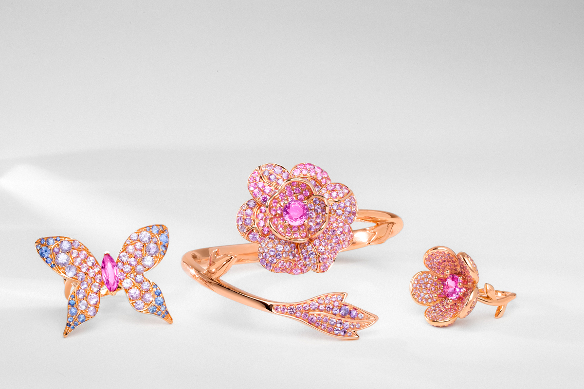 Los anillos y el brazalete incluyen centros de zafiros rosas en tallas redonda y marquise de un color excepcional. Alrededor de estos, un pavé formado por una cuidada combinación de zafiros multicolor talla redonda en tonos rosas, azules y lilas, consiguiendo un degradado de color único. Una mezcla armónica de colores pastel conseguida gracias a la minuciosa selección de cada una de las piedras y la manera en que han sido dispuestas.