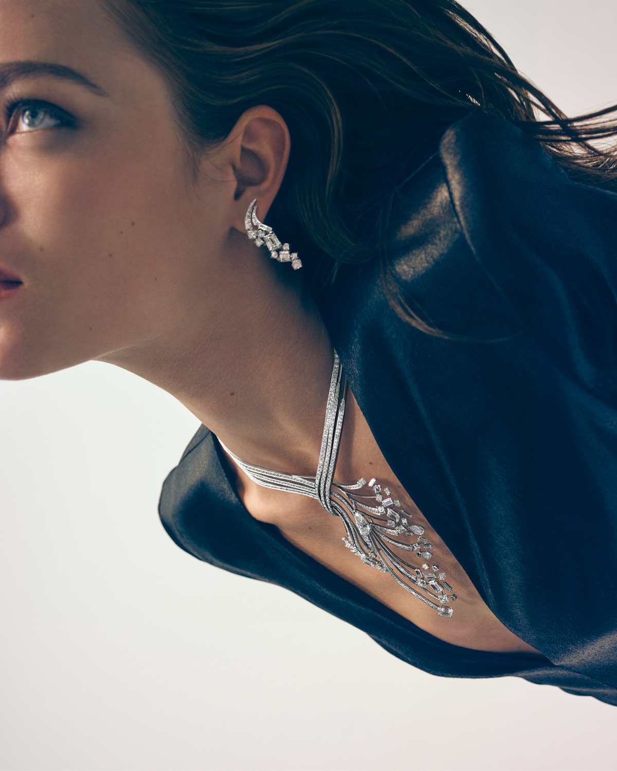 Como prolongación de Torsade de Chaumet, la anterior colección de Alta Joyería de la Maison y una oda a la vida y al movimiento, Déferlante se concentra en las firmas de Chaumet, desde la tiara hasta la joya transformable. En una fusión de contrastes, la colección posee la gracia inherente a las creaciones creaciones de Chaumet, capaz de evocar espigas de trigo acariciadas por el viento o el batir de las alas de un pájaro. Como una mezcla de tensiones cuidadosamente equilibrada, Déferlante destila el efecto del agua que brota agua en su combinación de tamaños, virtuosos escenarios y atrevidos ángulos.