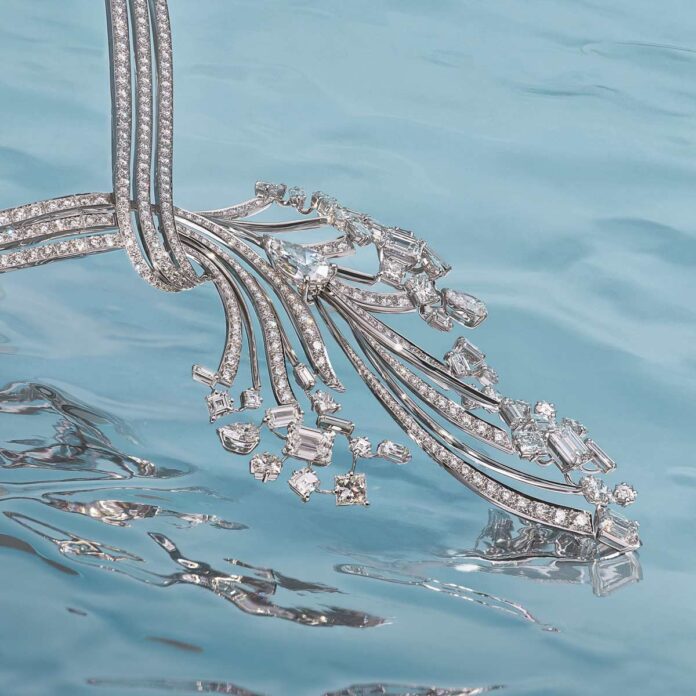 Con la colección Déferlante los artesanos del taller 12 Vendôme han vuelto a realizar hazañas extraordinarias en el arte de evocar el agua en todas sus formas. En efecto, cascadas, gotas y estalactitas que animan las diademas, los adornos para el cabello, los broches y las peinetas de Chaumet.