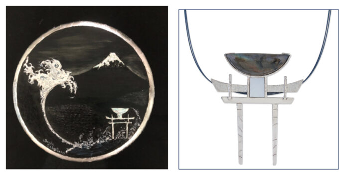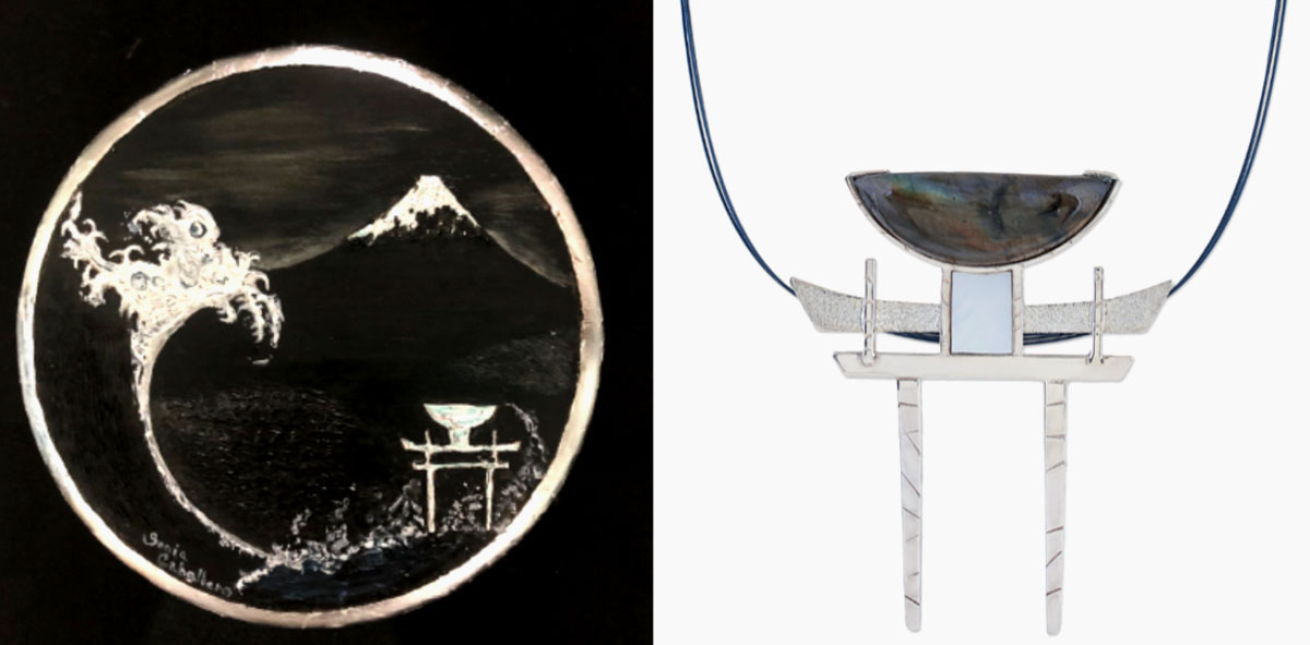 Óleo y Plata de ley sobre tabla. Una creación en la que fusiono técnicas de arañado de Urushi y escuela Rinpa Japonesa, 20 cm. Namí en Japonés significa “ola” y es el resultado de la inspiración de dos obras, la joya “Tori” de Laura Márquez y la obra “Eclipse” de Sonia Caballero.