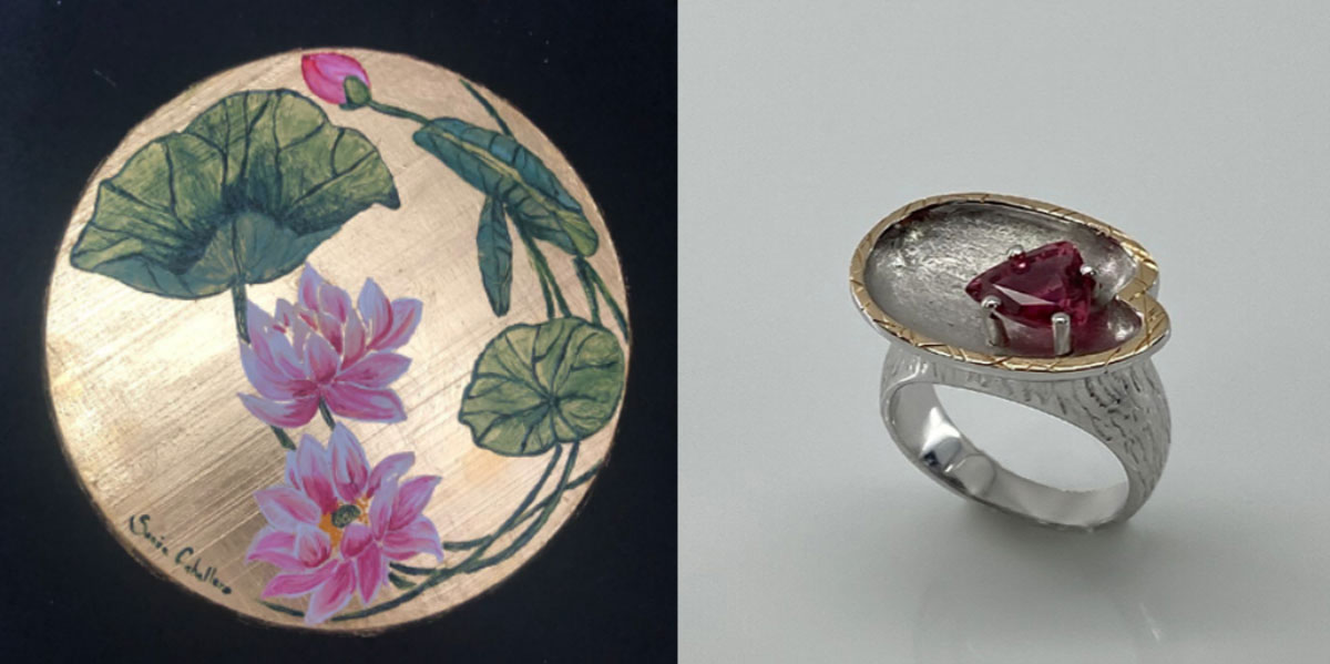 Oro de 24k y óleo sobre tabla. 20cm. Técnica Rimpa japonesa. Suiren significa nenúfar en japonés y representa el mes de julio en una colección de “Los doce meses” de Sonia Caballero. Un delicado diseño que simboliza la naturaleza jugando con texturas, el brillo del oro y los colores de las flores. Suiren y las joyas de Laura Márquez inspiradas en nenúfares son una pareja de fusión entre arte y joyería.