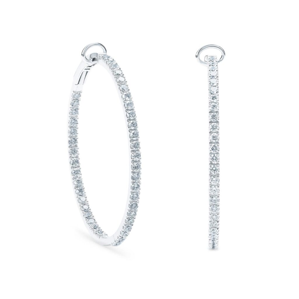 Candela Peña ha escogido unas criollas de oro blanco con diamantes talla brillante, dos anillos en espiral de oro blanco con diamantes y otro anillo de oro blanco con filas entrelazadas de diamantes talla brillante.