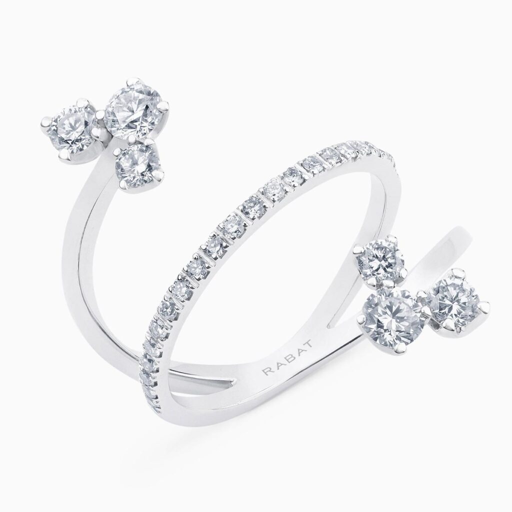 Lola Rodríguez ha optado por dos anillos de oro blanco con rivière y flor de diamantes talla brillante y unos pendientes earcuff de oro blanco con rivière de diamantes talla brillante.