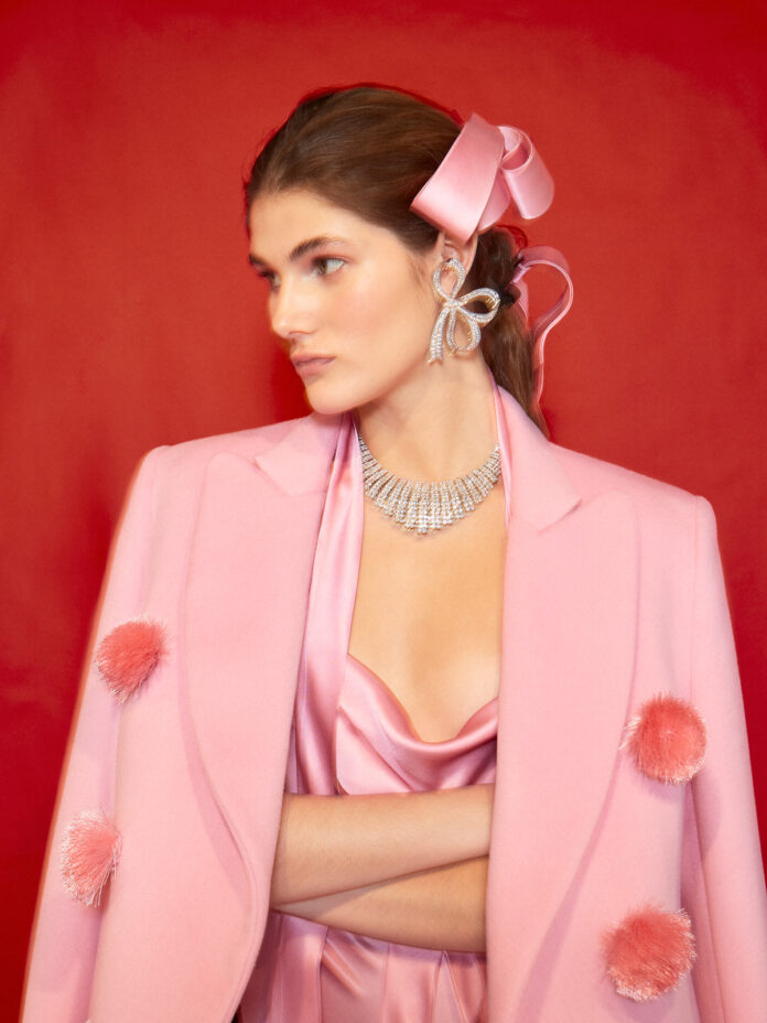 Entre tonos vainilla en largos abrigos de sastre, camisas de tafetán, un traje/short de edición limitada, rosáceos que representan rumor e sonrojados granates para la inocencia, el negro seductor que tampoco falta, lazos que aparecen estampados sobre satén de seda, lazos usados para rematar prendas o bolsillos… aparecen también lazos de cristal en forma de pendientes, para embellecer las orejas de una manera especial. Y es que su forma, su brillo y su tamaño han hecho que a ninguno se le escape este gran detalle: maxi pendientes en forma de lazo.
