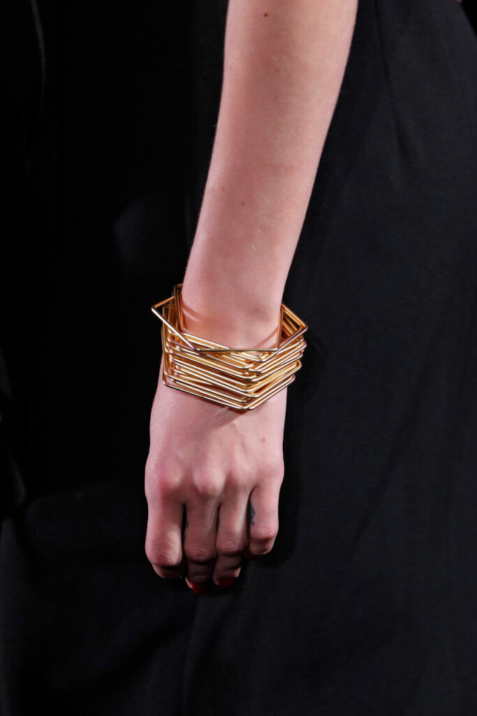 Looks impecables y una paleta de colores encendida, el dorado fue conductor de una colección que presenta a una mujer atrevida, elegante y sofisticada. Este dorado fue protagonista también en la joyería, con maxi pendientes geométricos y brazaletes que se superponían adornando toda la muñeca.