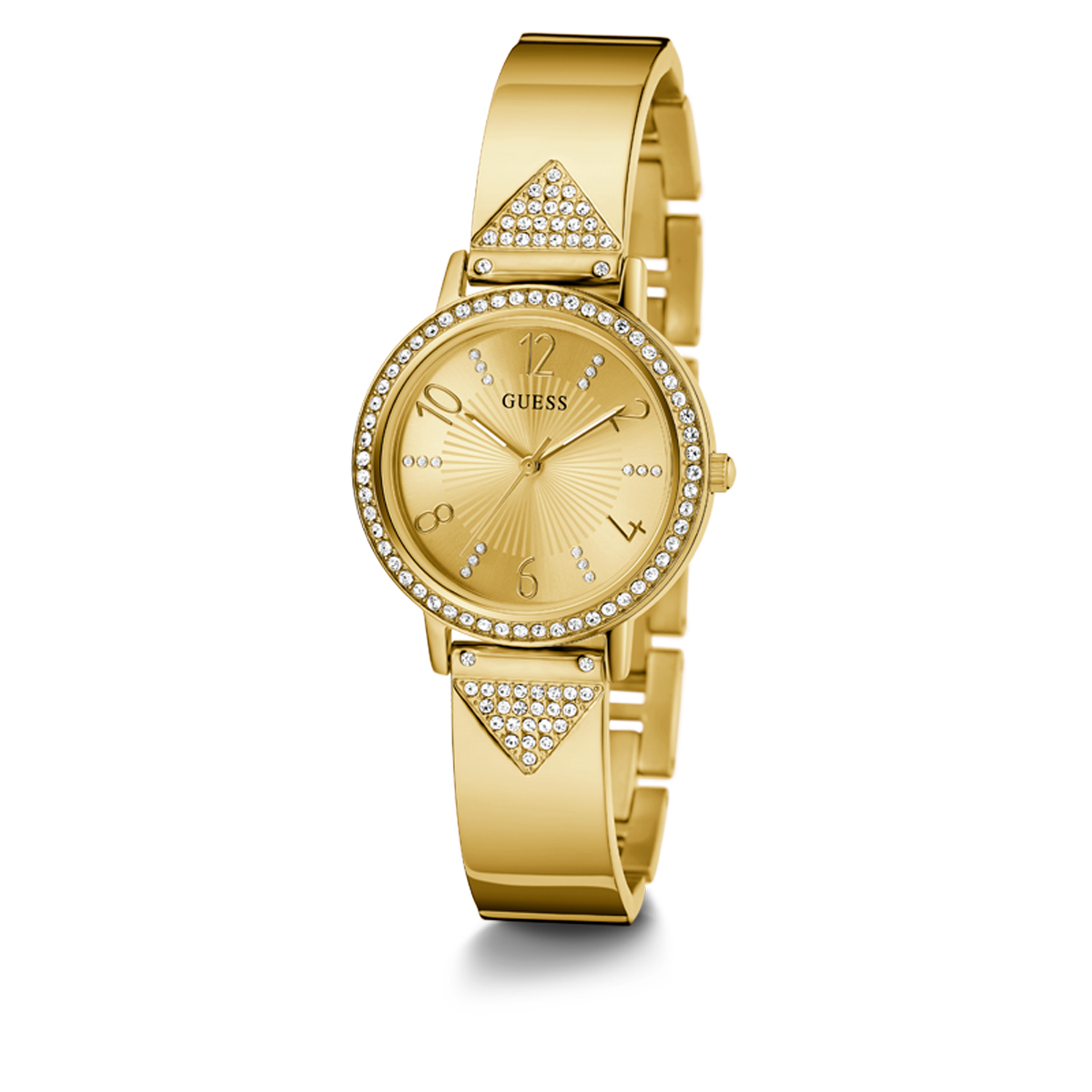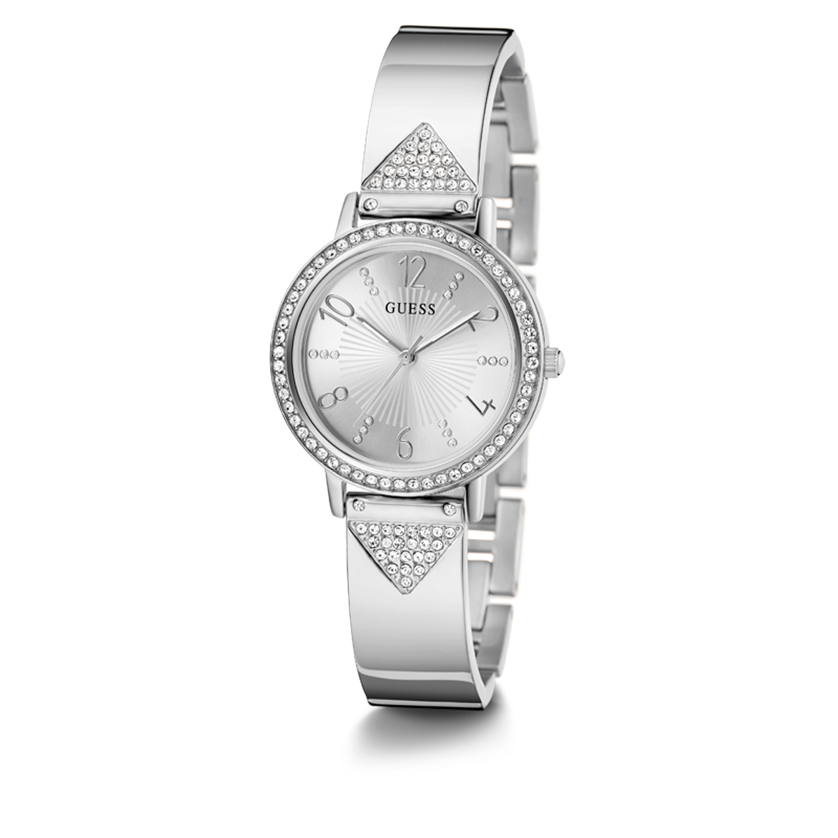 Guess apuesta en esta colección por las transparencias, por ello la caja de Crystal Clear, de 33 mm, desvela su lado más provocador y lo recubre de pedrería, así como la esfera, que se llena de cristales «flotantes». Con versión en dorado y plateado, el brazalete con diseño elegante hace de este modelo el perfecto para cualquier mujer.