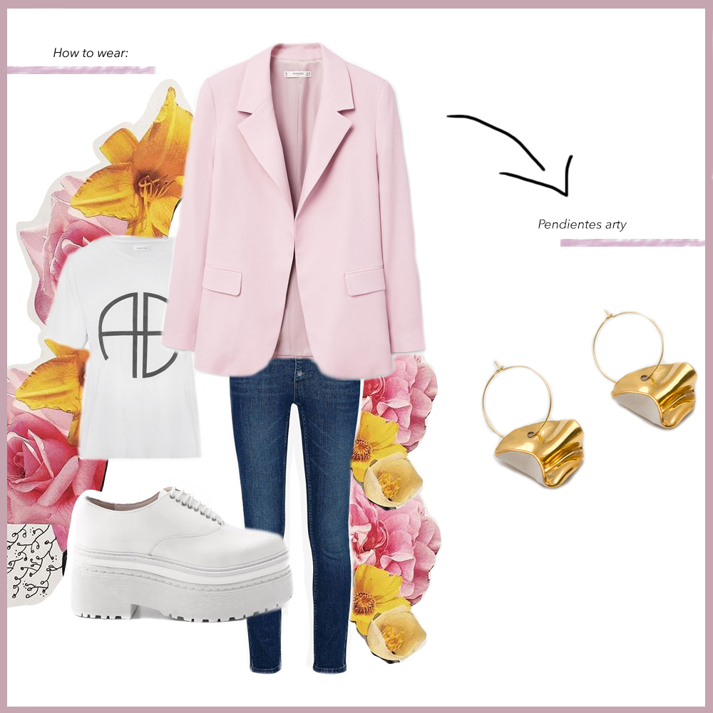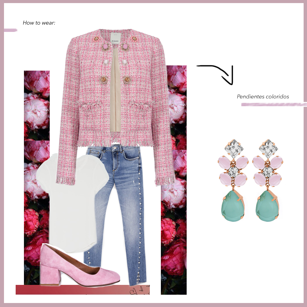 Para las más románticas el look más casual y el que más «que me pongo» ha salvado, también es una opción donde la clave, una vez más, está en los detalles. Una chaqueta tweed a juego con unos zapatos rosa que se fusionan con unos pendientes en tonalidades pastel. Pendientes de Victoria Cruz.