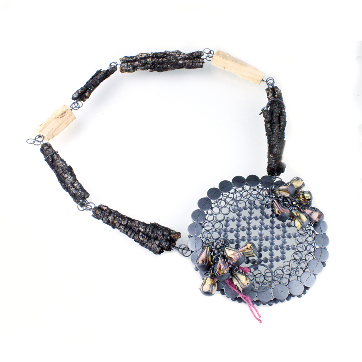 «Lien» («Gravamen») se define como una deuda o un derecho de nacimiento. Este es también el apellido de mi bisabuela paterna. La genética heredada, el trauma y el conocimiento son resistentes al cambio cultural y son como una vibración en el cuerpo mientras se abren camino hacia la superficie. Esta serie aborda mi deseo de comprender la idea del derecho de nacimiento y las deudas que debemos pagar con nuestro cuerpo y mente para encajar y sobrevivir mientras vivimos en la diáspora, como una especie invasora. Esta obra recuerda a la joyería tradicional y emplea diseño, técnicas y materiales que revelan y ocultan. A través de cada pieza cortada y soldada, puedo acercarme a mi verdad. Valoración del jurado: Por el impacto visual, la belleza compositiva, la consolidación formal, la sensibilidad y el concepto de la pieza.