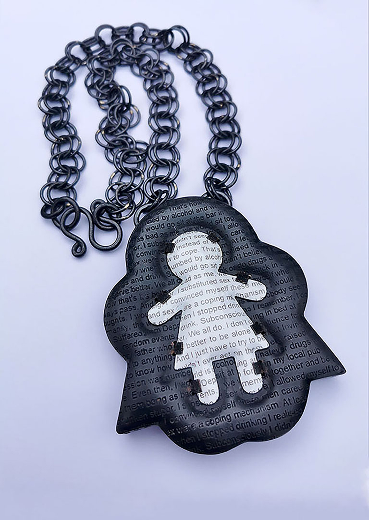 La pieza se basa en una historia compartida sobre recuerdos de infancia que tuvieron un efecto profundo en el viaje de la vida de una mujer y su salud mental. Sus palabras están grabadas en el propio medallón. Las joyas que crea surgen a partir de historias compartidas, son sobre experiencias de salud mental. Sirven como puntos de partida para conversaciones sobre su significado y su contexto, un tema que está arraigado en la sociedad. Valoración del jurado: Por cómo transmite y se acerca al tema de las enfermedades mentales a través de las técnicas tradicionales como son el grabado ácido, el embatado y el esmalte.