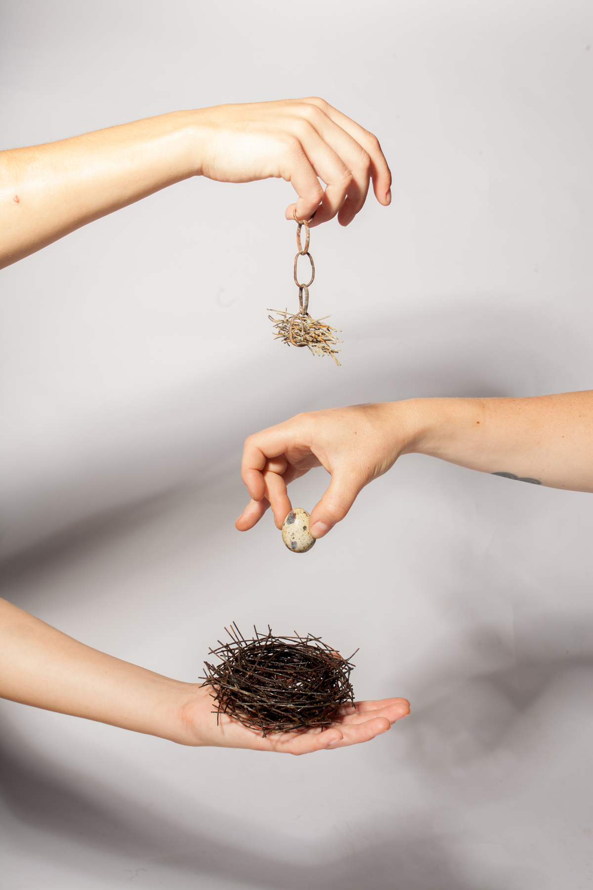 Conjunto de dos piezas. Un broche soporta un huevo de codorniz que hace alusión al comienzo de una nueva vida. El anillo hace alusión a un manojo de hierba. El huevo es un objeto delicado que contrasta con lo rígido y punzante del metal. La ironía de la joya es la incomodidad de la misma, pues debe ser llevada siempre al hombro y con un huevo de codorniz. Cuando no se utiliza, esta vive como objeto escultórico sobre un papel con los rastros de su proceso de oxidación. Valoración del jurado: Por cómo integra, y de una forma muy natural, la joyería en el ámbito artístico.