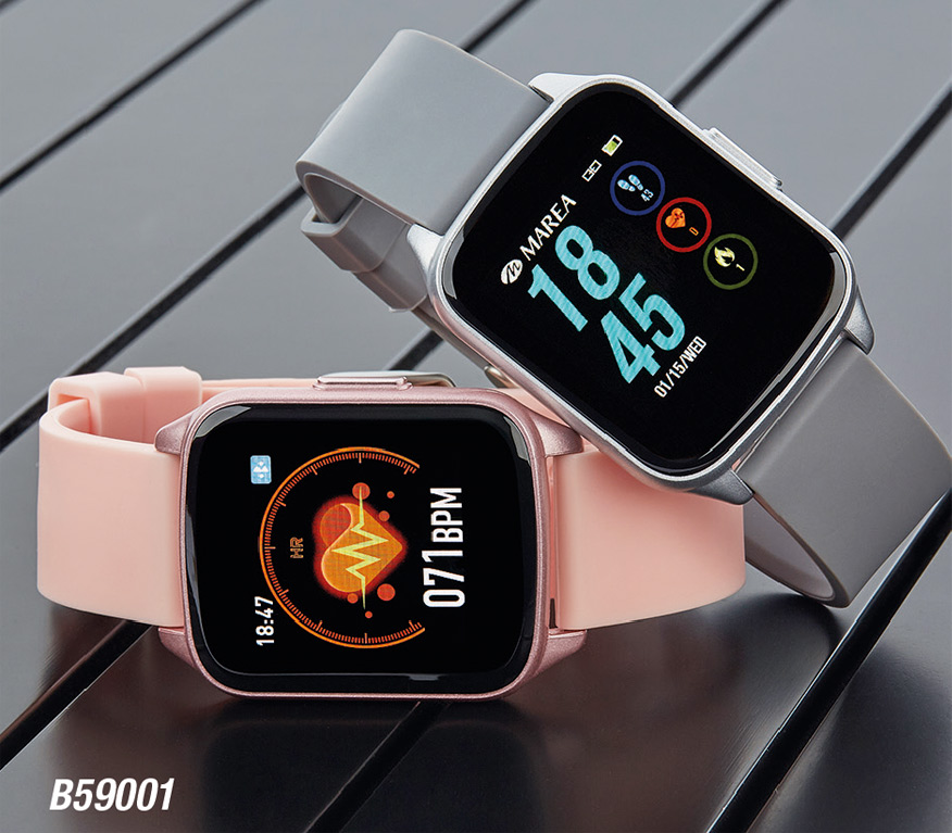 El nuevo Marea Smart cuadrado de primer precio (39.90€), con todas las funciones básicas relacio- nadas con la salud, conectividad y deporte, y con correa de caucho en cuatro colores diferentes. Con pantalla de gran definición y una alta velocidad de cambio de pantallas. Un smartwatch donde podrás sacarte selfies y controlar tu música del móvil.