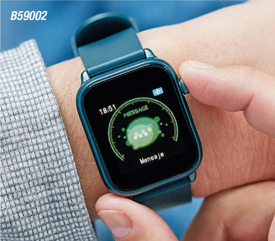 Este nuevo modelo unisex cuadrado combina a la perfección diseño, calidad y precio (49.90€). Con una pantalla totalmente táctil y una combinación de cinco colores que lo hacen diferente, actual y divertido. Es un modelo que lleva incorporadas las funciones más demandadas por el consu- midor, como notificación de llamadas, whatsApp, frecuencia cardíaca, pasos y distancia, entre muchas otras. Es ideal tanto para realizar deportes como para combinar tus looks más casuals.