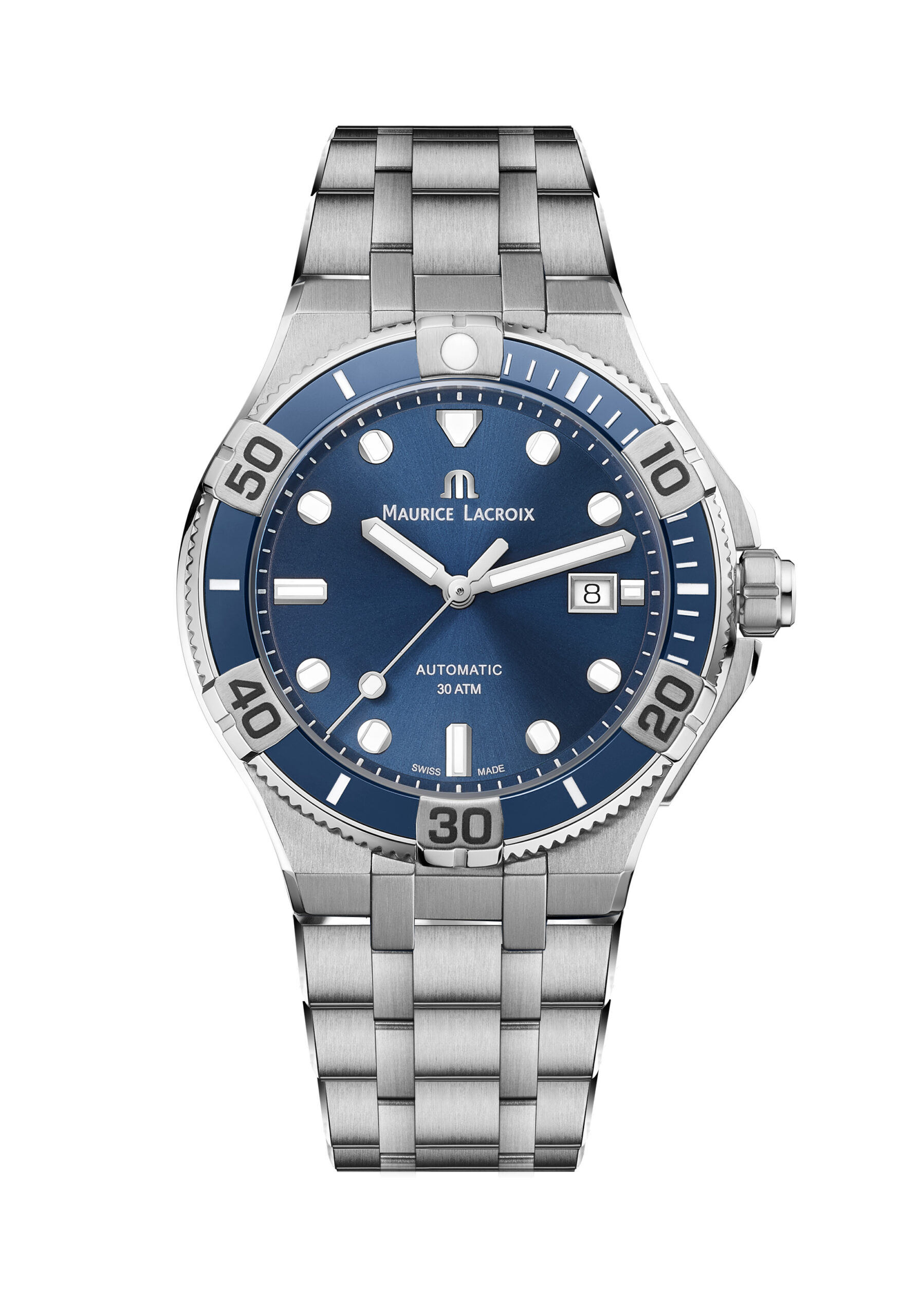 Esta misma filosofía ha inspirado la nueva correa de caucho, a juego con el color de la esfera. Además de ser cómoda e impermeable, resiste también las altas temperaturas. El centro está atravesado por una banda de cuadrados, patrón que evoca la angulosidad, uno de los rasgos característicos del diseño de los AIKON. Aquí es donde se sitúa el logotipo «M» de Maurice Lacroix, idéntico al que adorna las correas de piel de la marca.