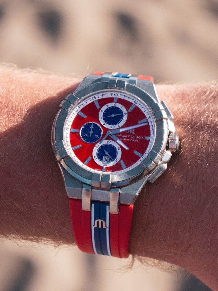 El AIKON Quartz Chronograph – Edición limitada Vikings de 250 piezas presenta los colores del equipo de vóley-playa Vikings, los tonos azules, rojos y blancos. El reloj se presenta en una caja de acero inoxidable de 44 mm. Vestida de rojo, la esfera presenta un efecto cepillado soleil e incorpora tres contadores acaracolados en un tono azul que contrasta. Desde sus inicios, el AIKON siempre se ha caracterizado por mezclar diferentes acabados en su esfera y caja, enriqueciendo la experiencia del propietario.
