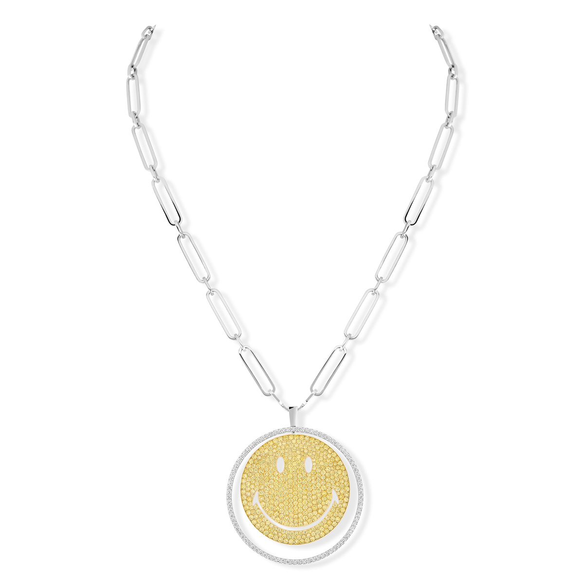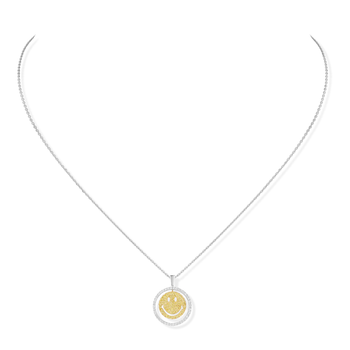 En una primera propuesta, el colgante Lucky Move desvela un Smiley en diamantes amarillos rodeado de un anillo de oro blanco con pavé de  diamantes.